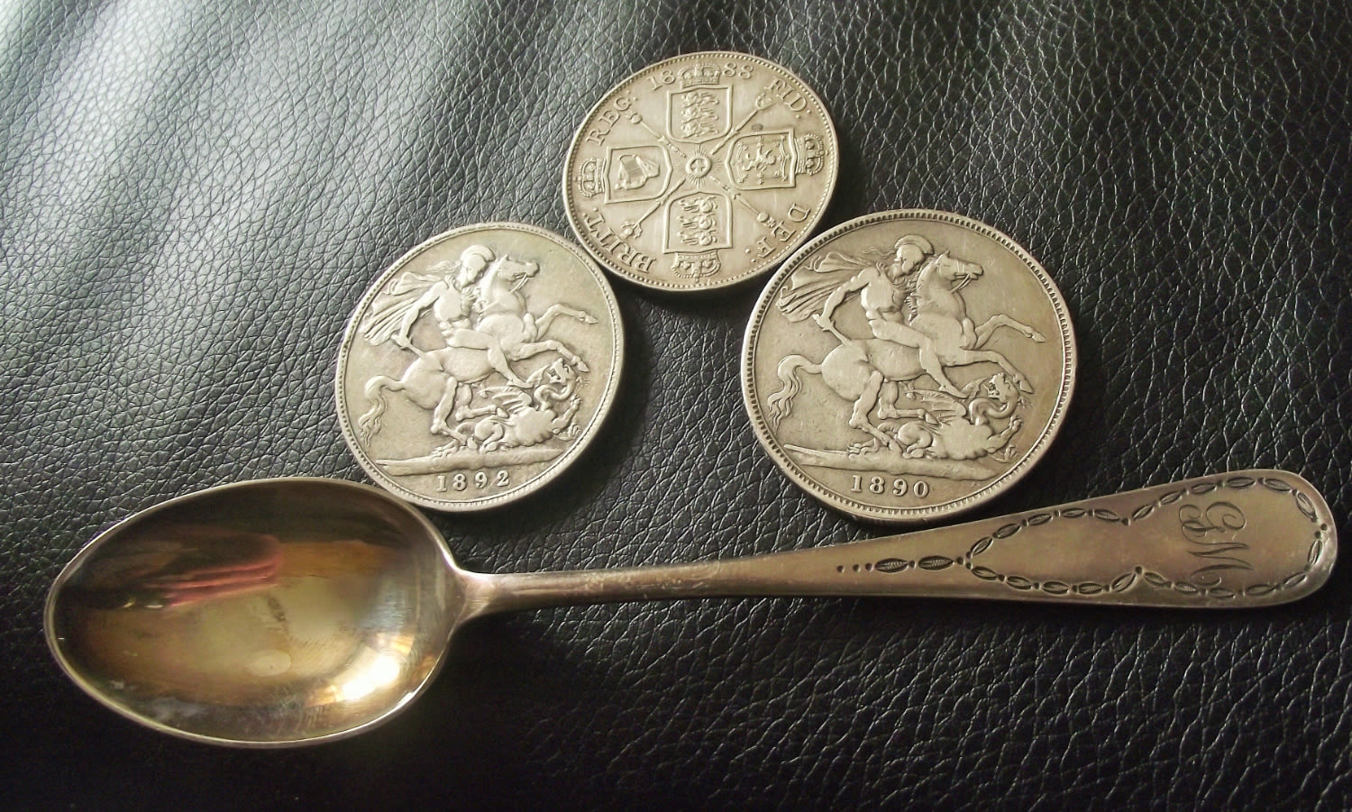 Queen Victoria 1888 silver Double Florin / Jubilee Head ( good condition) + 1892 & 1890 Queen Victoria Jubilee Head Silver Crowns in good condition + silver spoon Sheffield 1918 with engraved handle
