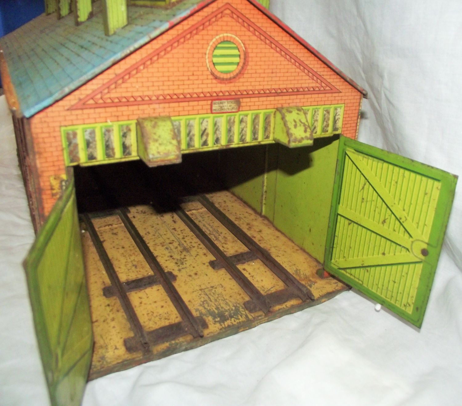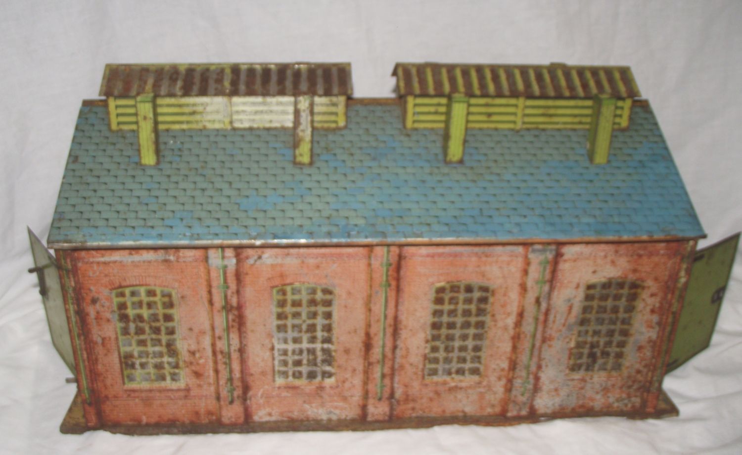 Rare Large Hornby 0 Gauge tin plate No.2 Engine Shed with 2-rail tinplate Track, 4 chimney’s and 2 air ducts . 18×10.5″ approx