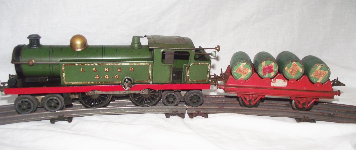 Hornby O Gauge 4-4-4T LNER Locomotive clockwork, gold steam dome , No key ,Works when wound + rare O gauge Hornby O Gauge Castrol Barrel Wagon