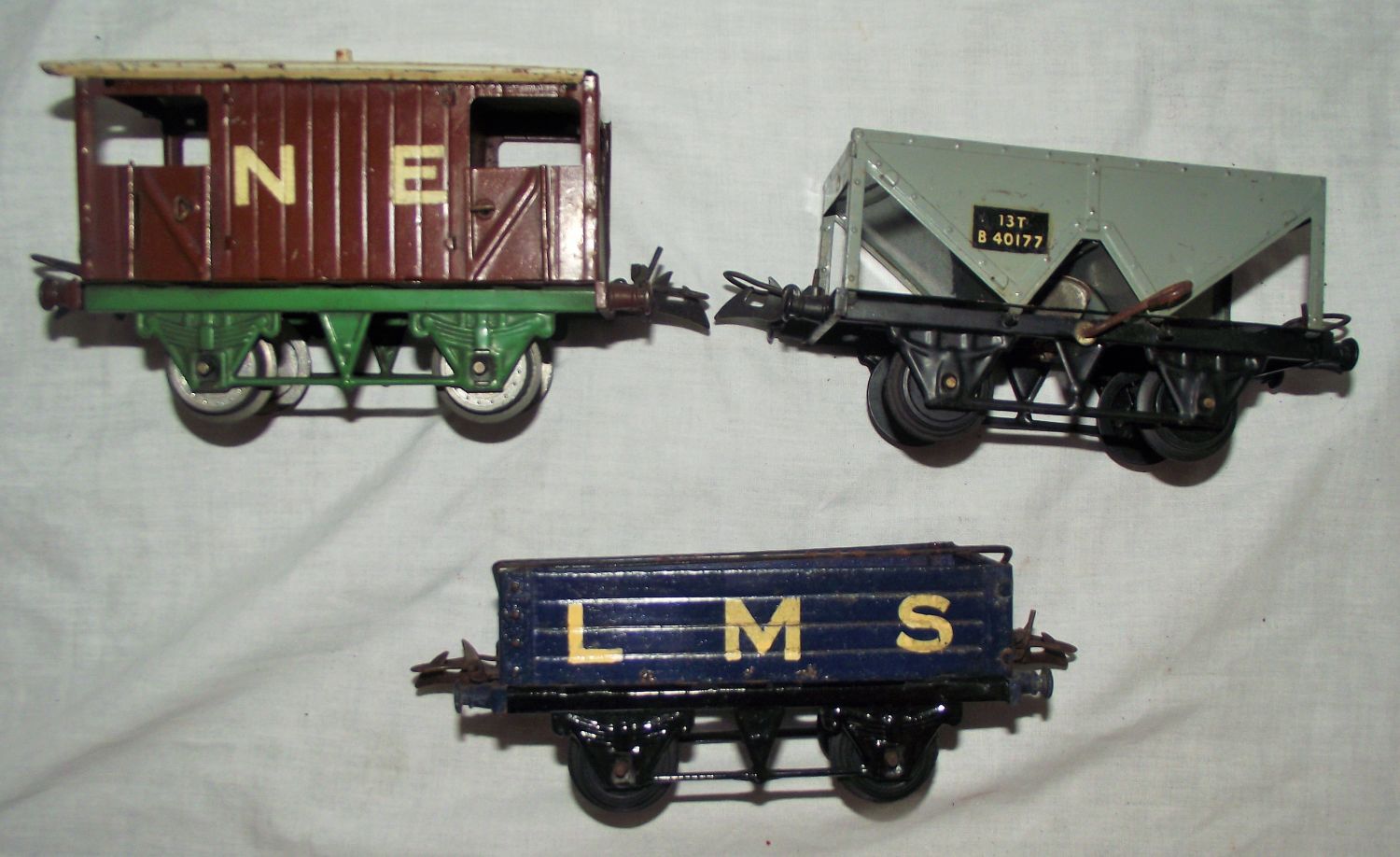 HORNBY /MECCANO O GAUGE TINPLATE GREY 13T HOPPER WAGON B 40177 + O GAUGE LMS BLUE SIDED WAGON + HORNBY BROWN & CREAM LIVERY BRAKE VAN