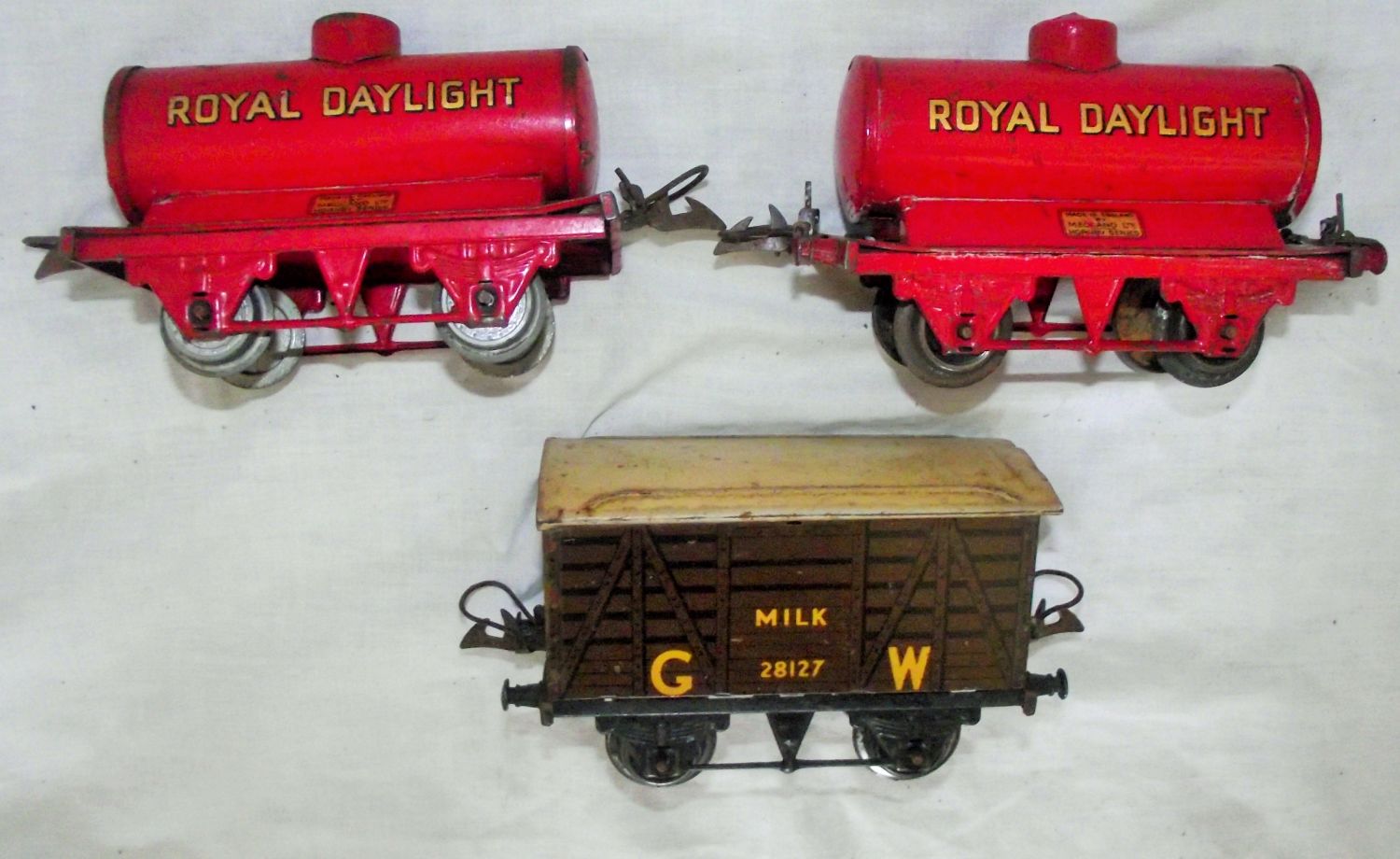 2x VINTAGE HORNBY O GAUGE TINPLATE ROYAL DAYLIGHT TANKERS UNBOXED + O Gauge HORNBY SERIES GW Milk Traffic Van – 28127 Brown – unboxed