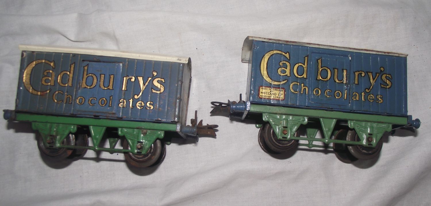 2x Rare Hornby Series gauge O private owner van, finished in Cadbury’s blue with white roof green chasis