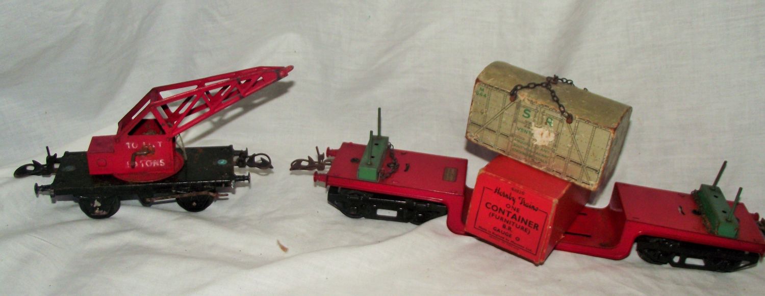 Hornby long low loader wagon unboxed + 10t Hornby crane wagon+ 1x Hornby furniture container in box+