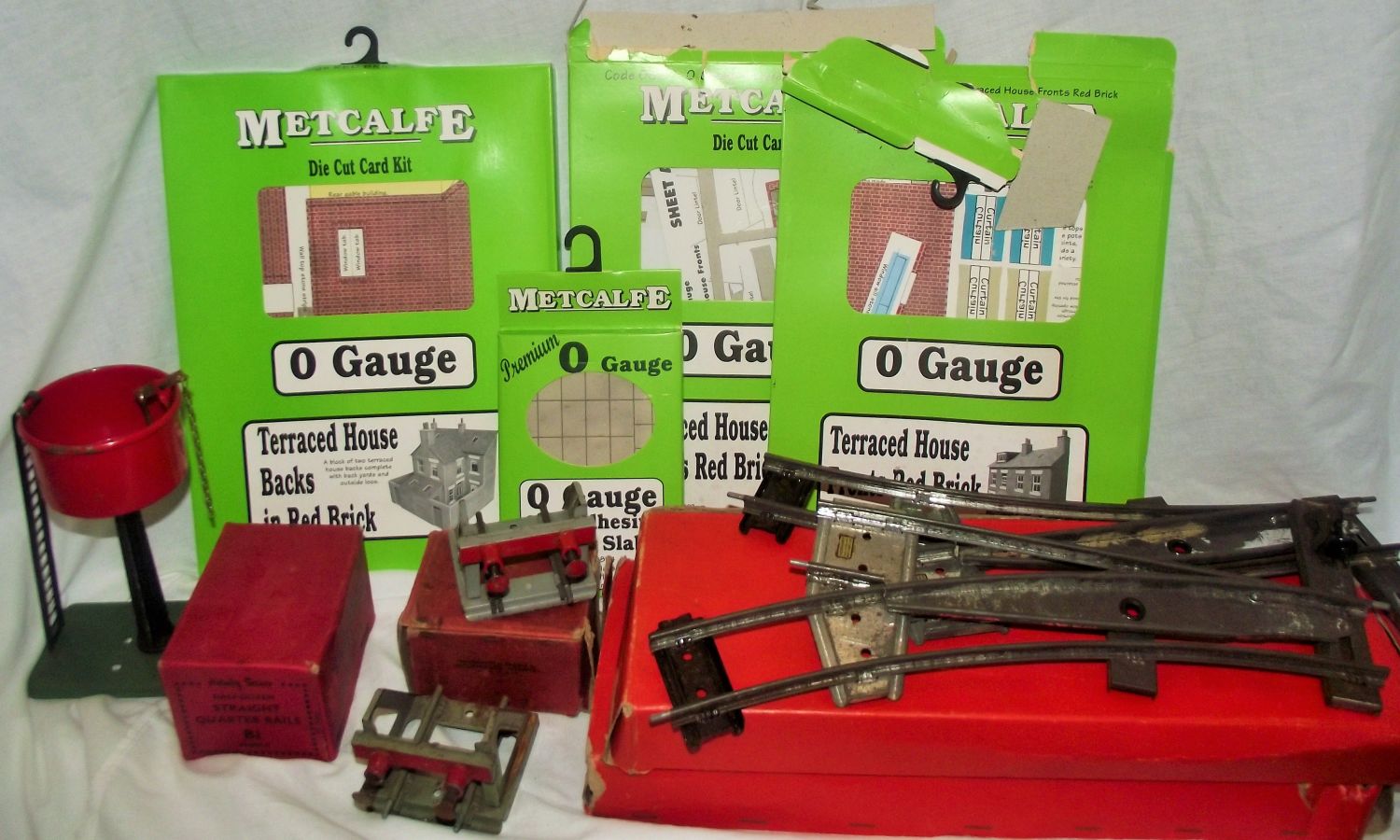 2x Hornby boxed 43083 points in original boxes two per box + 2x No1 spring loaded buffer stops 1 with box & 1 without box + hornby water tank unboxed + 1 unopened die cut card kits & 2 open card kits + unopened self adhesive paving slabs