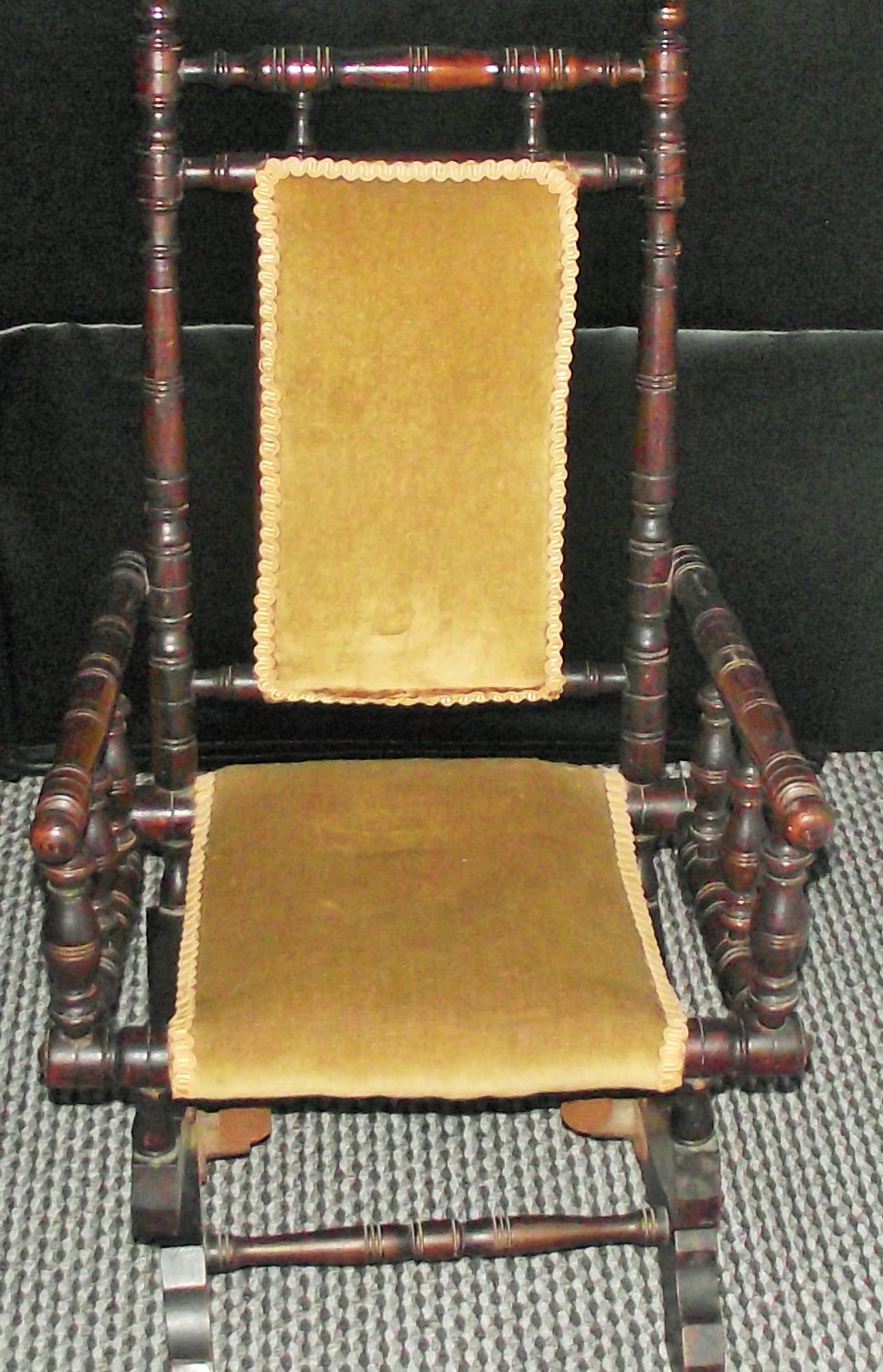 Vintage small childs rocking chair with turned wood arms and backrest with yellow velvet seat & back 29×18″ approx