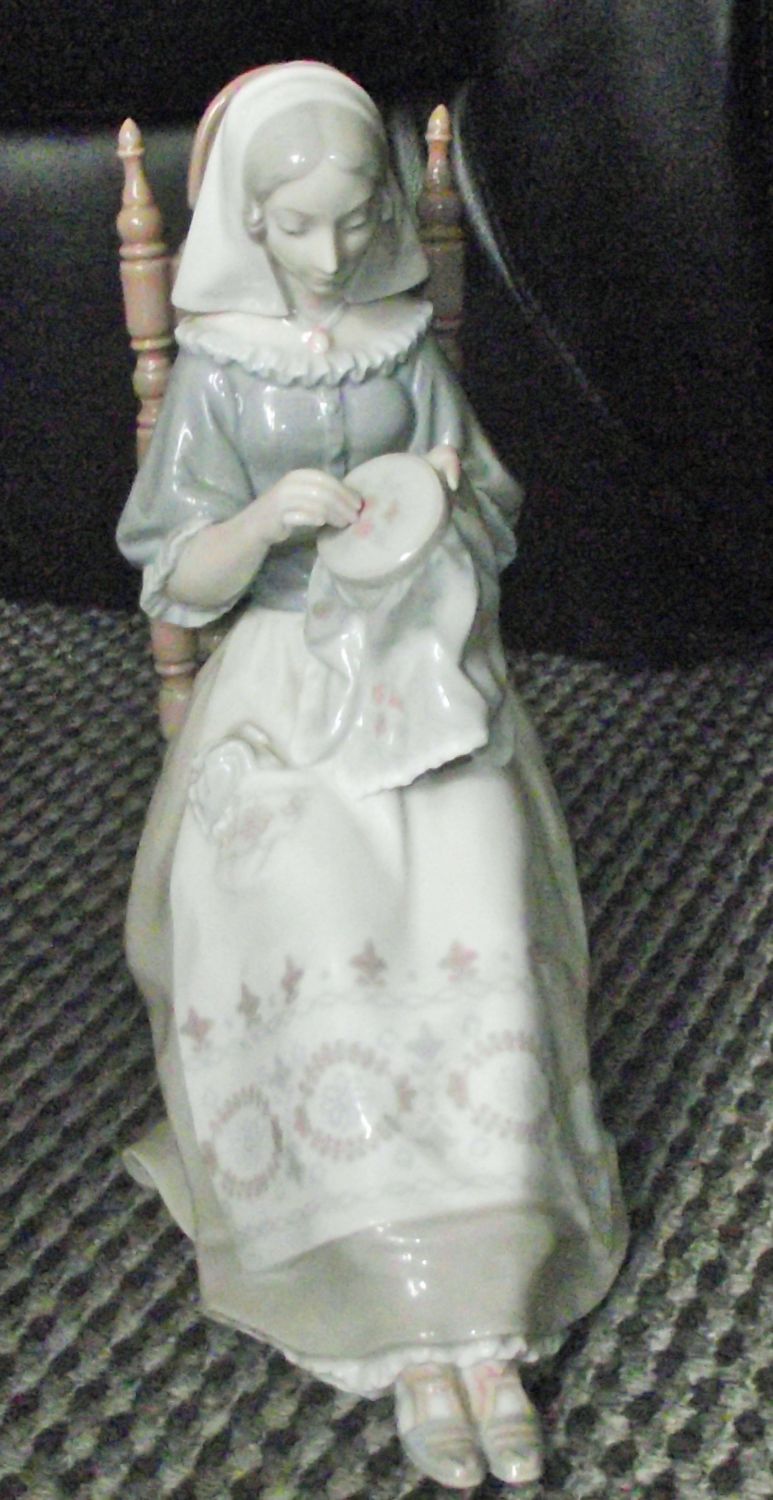 Highly sought after Lovely figure of seated woman working on embroidery. Lladro model no. 4865 Designed by Savador Furio Issued 1974 Retired 1994