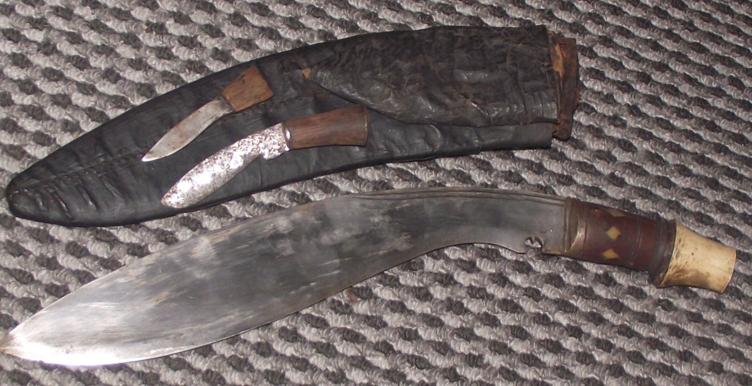 Very old Kookerie knife in original wood and leather stitched pouch with 2 smaller knives piece of horn fitted to end of handle