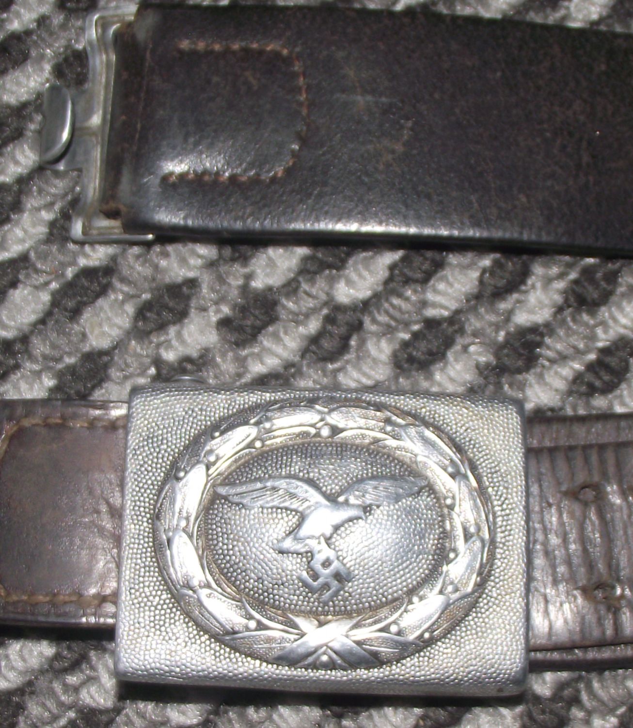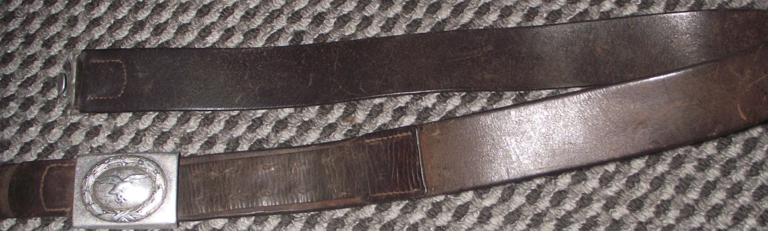 Rare WWII German Luftwaffe Buckle with leather Belt. The leather belt tang is maker marked and looks to be dated 1939 buckle marked S.H.u.Co. belt also has a name on it but not fully legible also numbered 80 (39″ approx inc buttle )