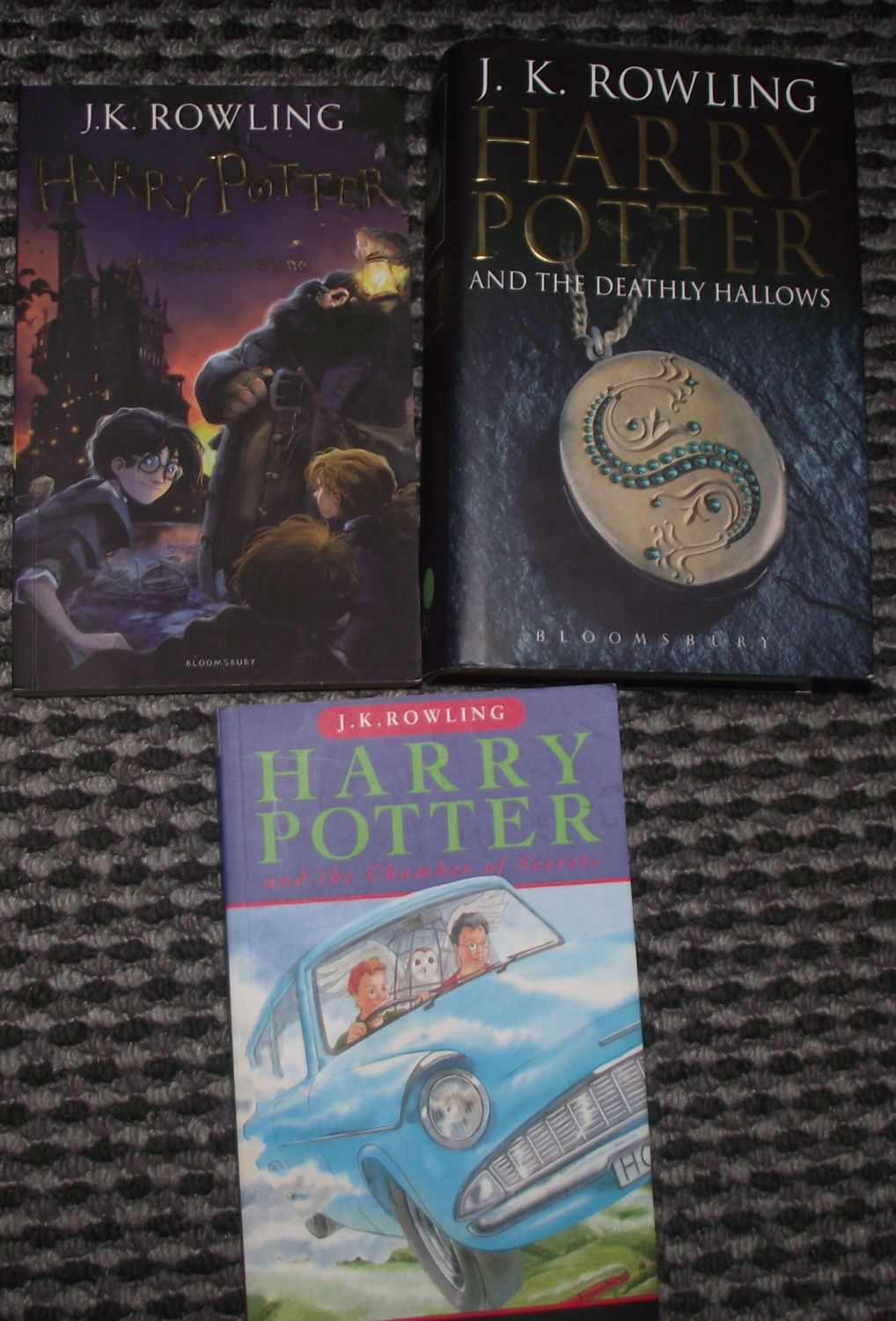 Harry Potter and the Deathly Hallows hard back 1st edition ISBN 9780747591061 with dust jacket + Harry Potter and philosophers stone paper back 2014 + paperback Chamber of secrets Isbn 0747538484