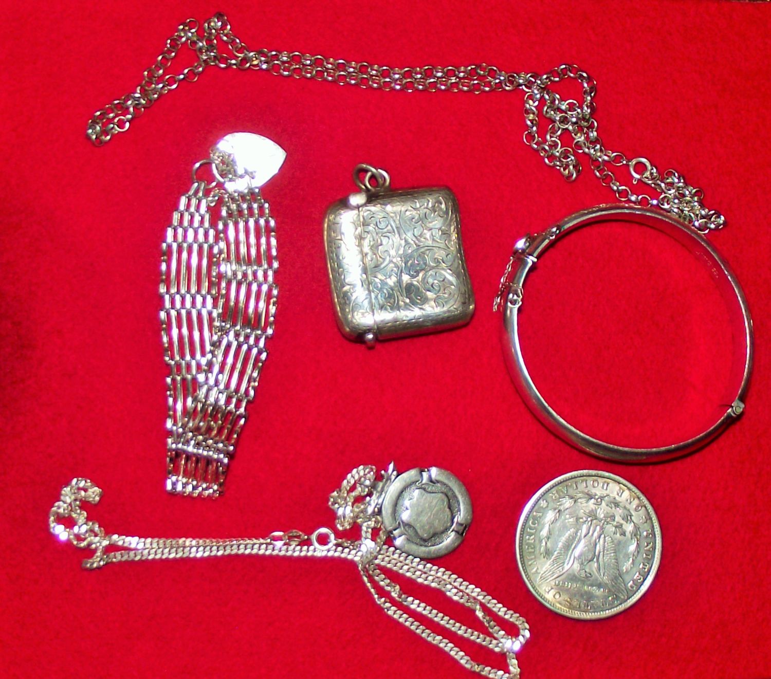 silver vesta case + silver fob on silver chain+ plated on silver box link bracelet + twisted style silver rope style neck chain + small silver gate bracelet + silver bangle + silver St christopher on silver chain+ silver plocket on silver chain + silver American Morgan 1921 Dollar coin 105g approx