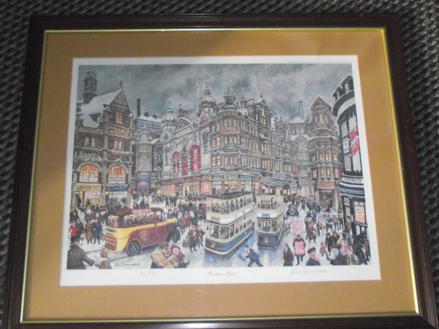 George Cunningham ( Sheffield Artist) Ltd edition signed print 188/500 Pinstone st signed in pencil lower right and signed on reverse. Hibbert Bros blind stamp 24x 20″