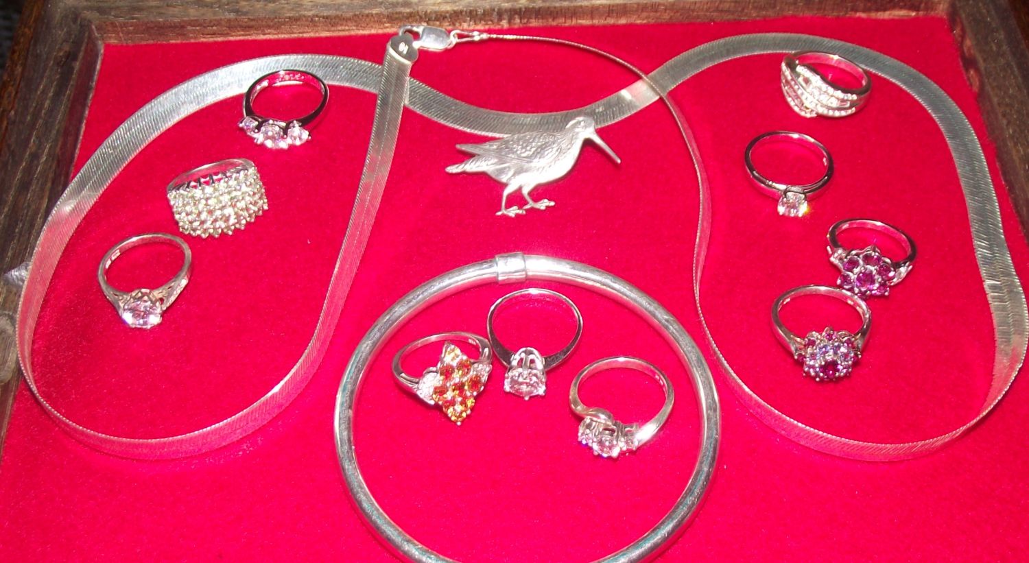 Ladies necklace bangle bird pin brooch and 10 ladies dress rings all marked 925
