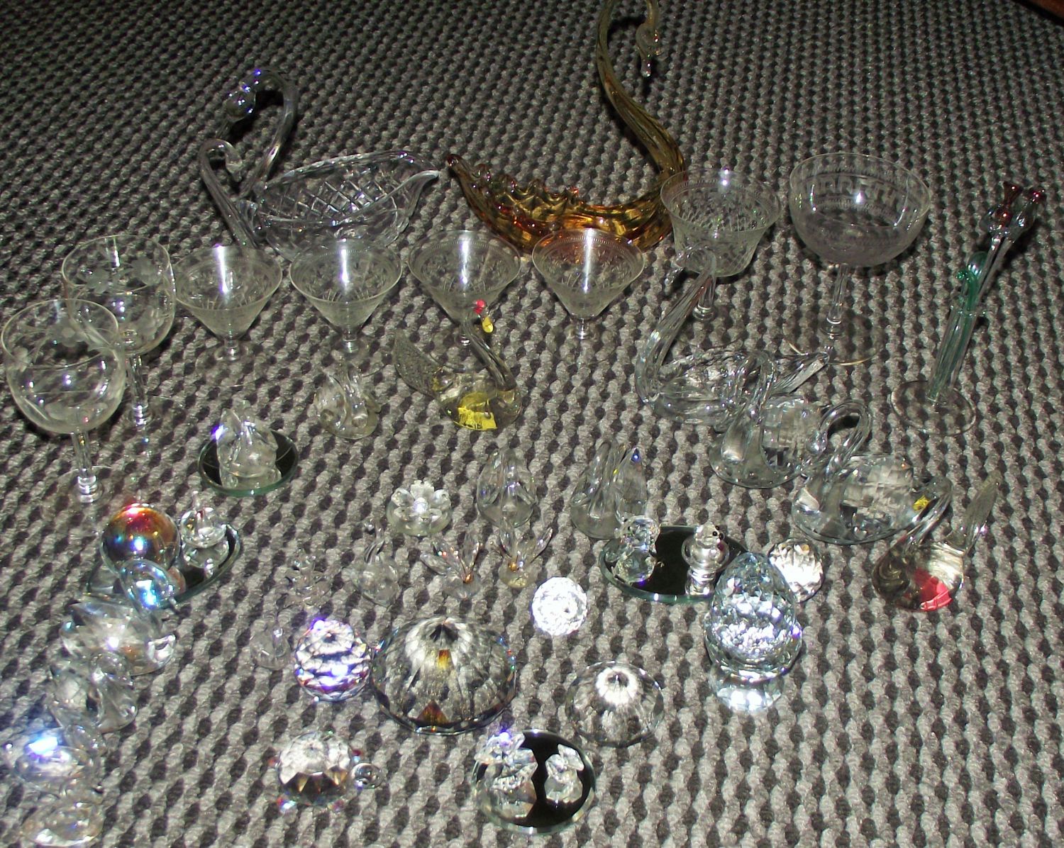 Collection vintage crystal animals , swans etc. +other glass swans , Vintage engraved glasses,glass drinks stirrers
