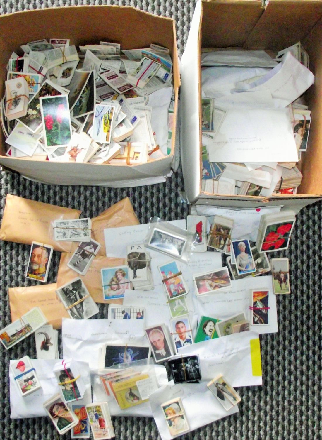 Very large collection of assorted cigarette , sweet cards etc , some in envelopes , some banded and some loose, 2 boxes in total