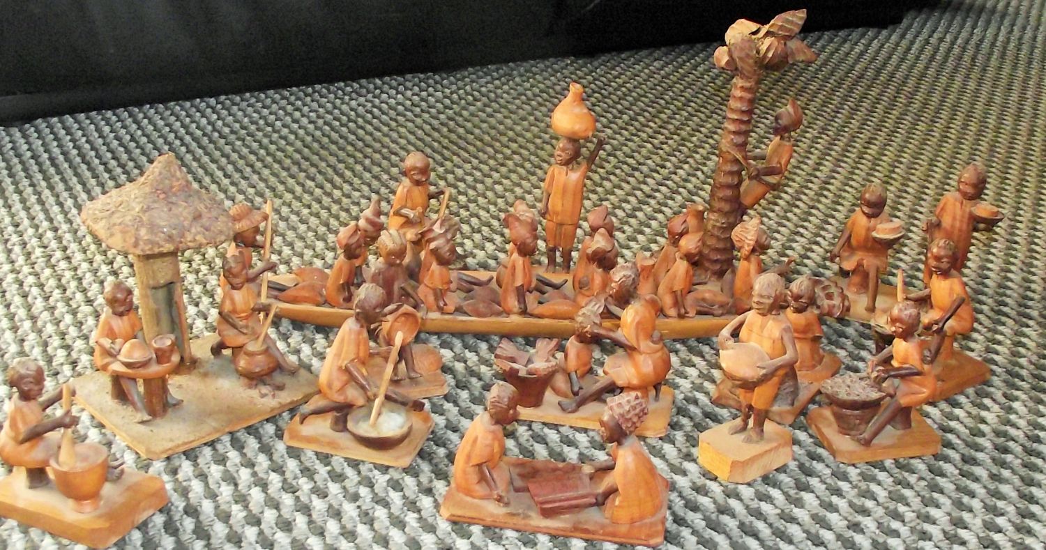 Small vintage African hand carved wooden figures depicting scenes from rural life ( given as a diplomatic gift in Nigeria 1970s )