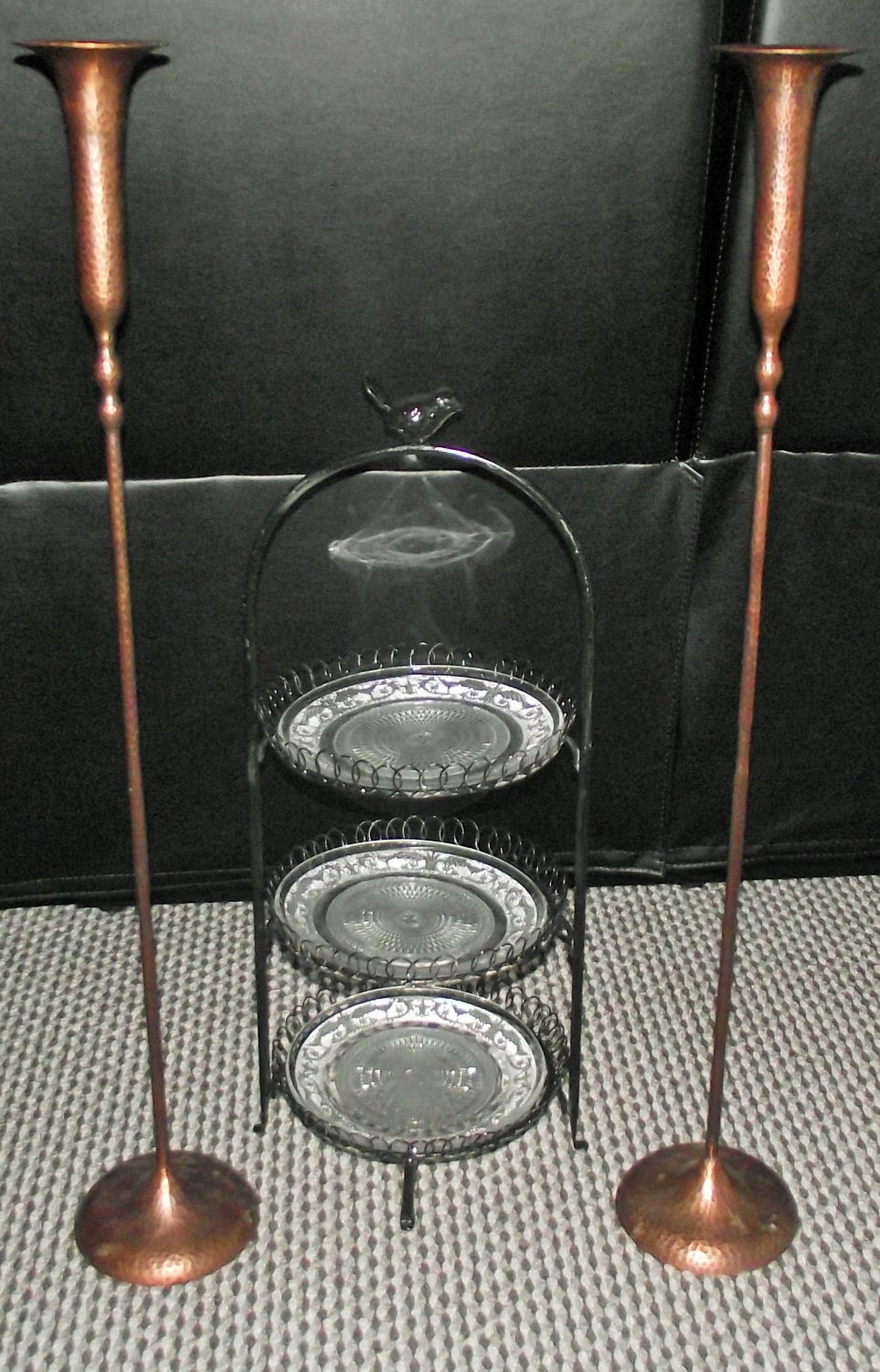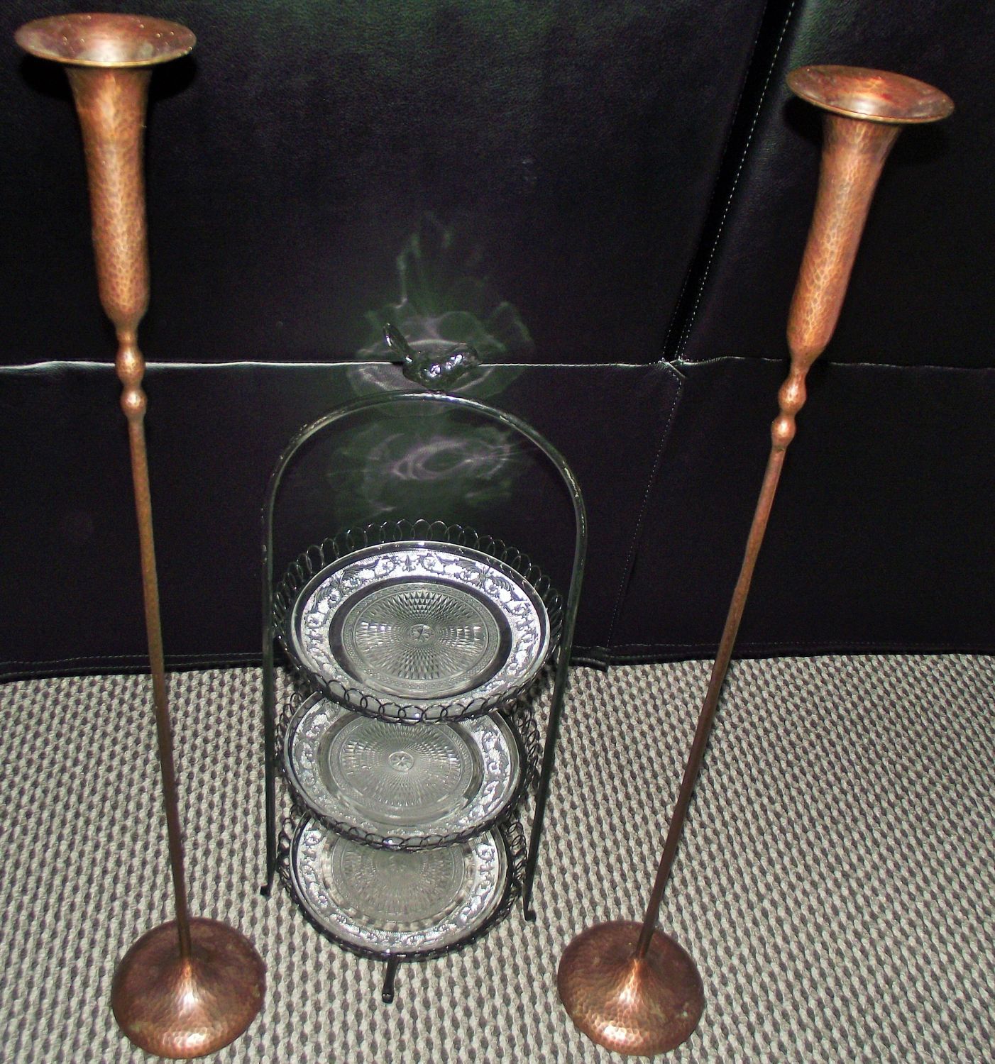 Pair hand made tall copper candle stands with hand beaten design 31″ approx weighted bases + Small table top 3 tier metal hand made cake stand with bird finial & 3 glass plates 24″ approx