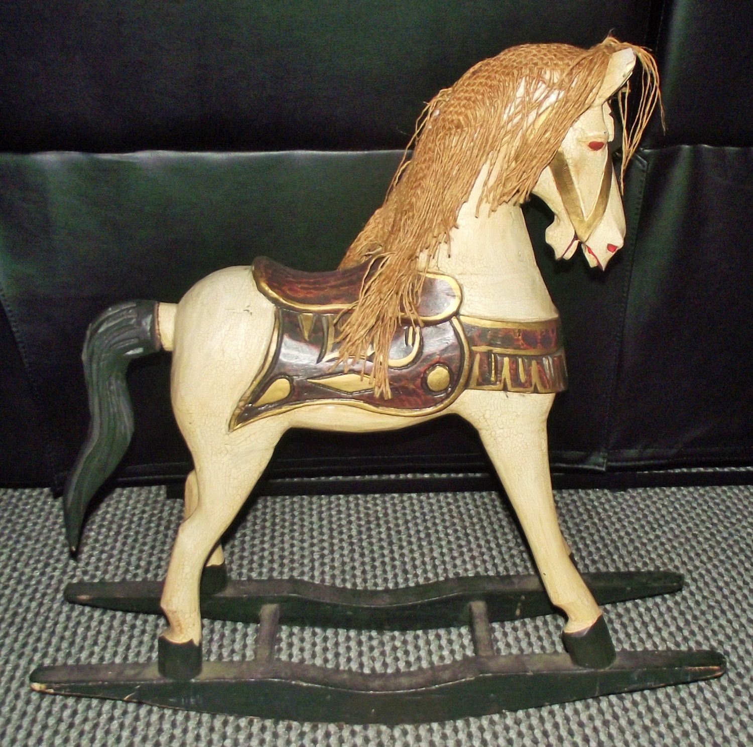 Small carved scratch built childs wooden rocking horse with carved sadle wooden carved tail 16″ tall to saddle 24 x26″size