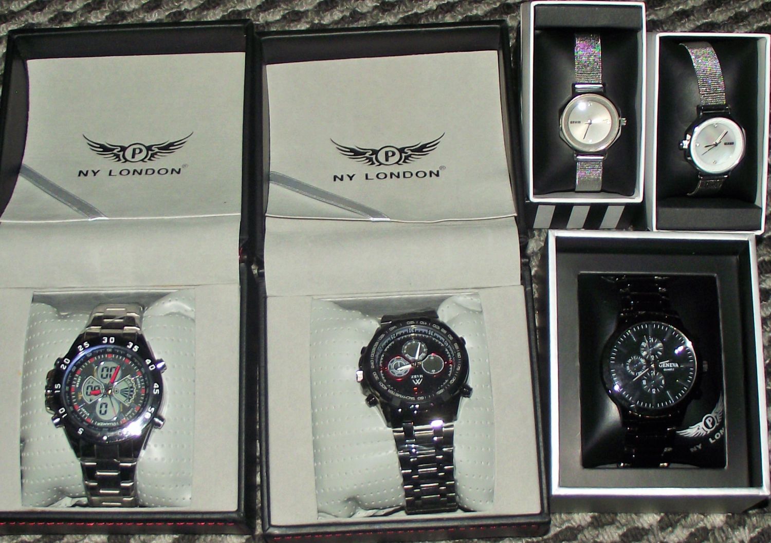 2 x Orvin stailess steel ladies dress watches in boxes + 3x boxed Gents N Y London sports watches all working at the time of cataloging