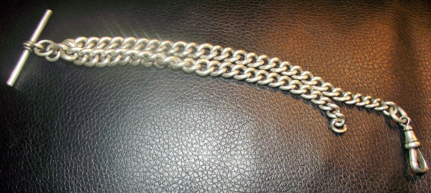 Silver double albert watch chain marked on each link & T bar & single watch clip 42g approx