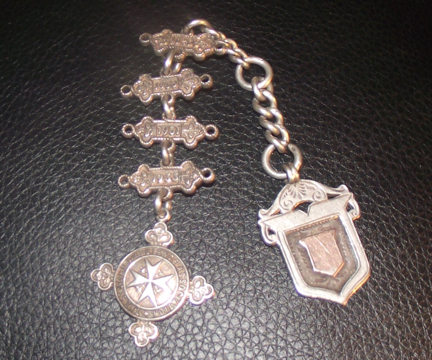 Silver watch fob with gold centre attached to 4x silver year bands 1929/30/31/33 + silver St Johns Ambulance service badge
