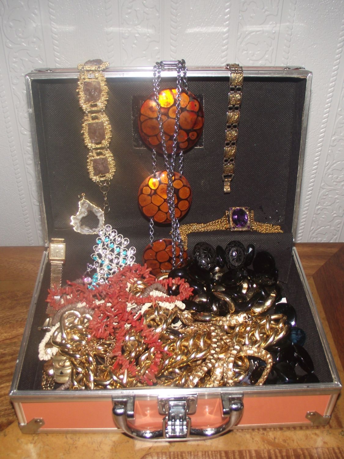 metal vanity case of good assorted costume jewellery inc beads, bracelets , plated crystal penandant , gold plated ladies Omega watch