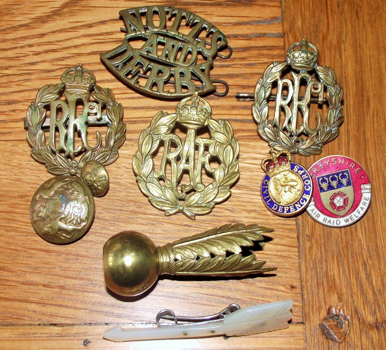 Collection of various forces badges , buttons brass etc + unusual brass Shako / plume holder for holing a feather plume on to a military hat