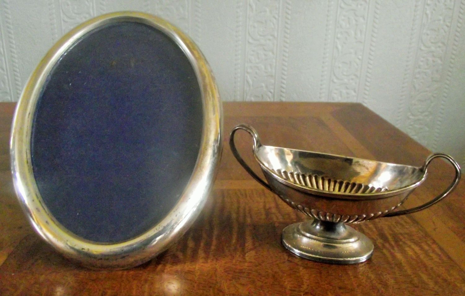 Antique silver weighted salt 1889 London Goldsmiths William Gibson & John Lawrence & oval silver picture frame