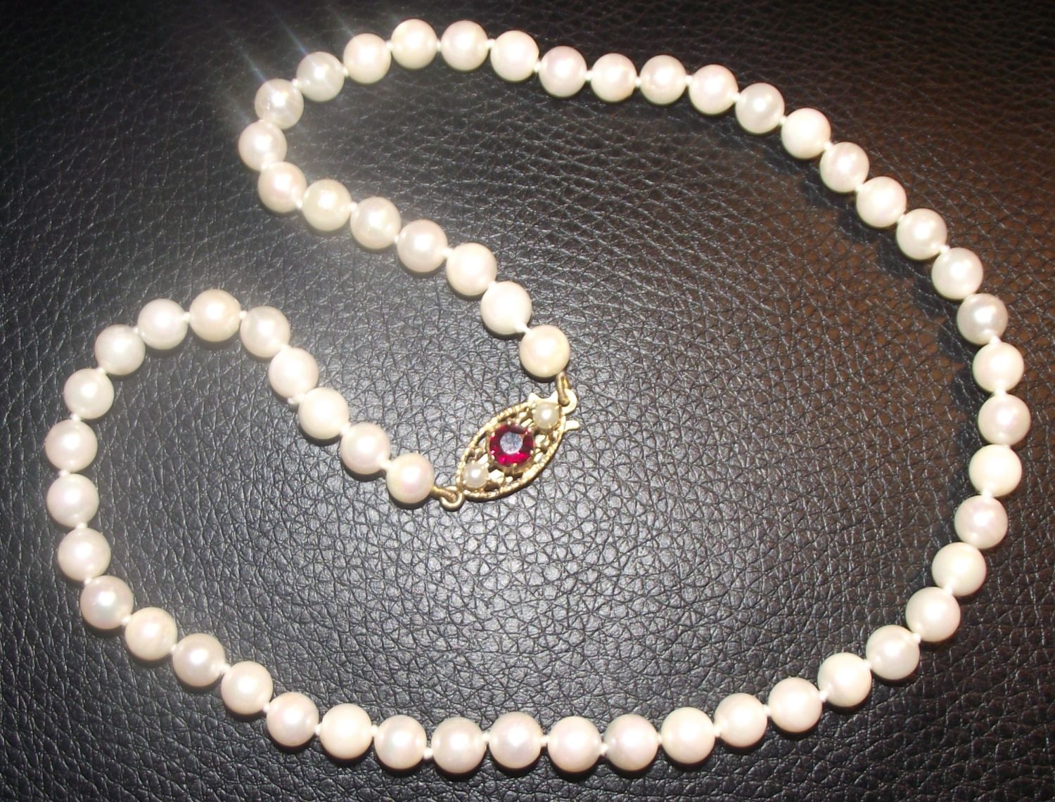 Ladies set of choker style pearls 14" with a fully hallmarked 9ct gold clasp set with 2 pearl and garnet centre