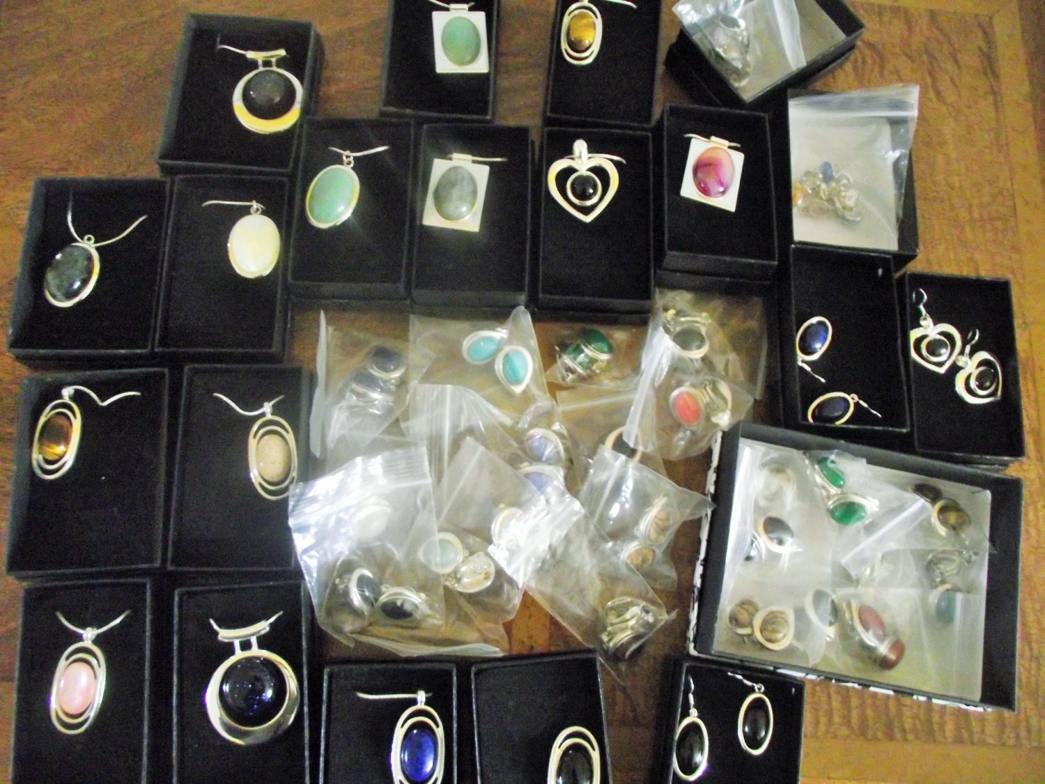 Large Selection of good plated jewellery set with various gemstones 15 pendants & chains in boxes + Earrings , earclips & earstuds in sealed plastic bags