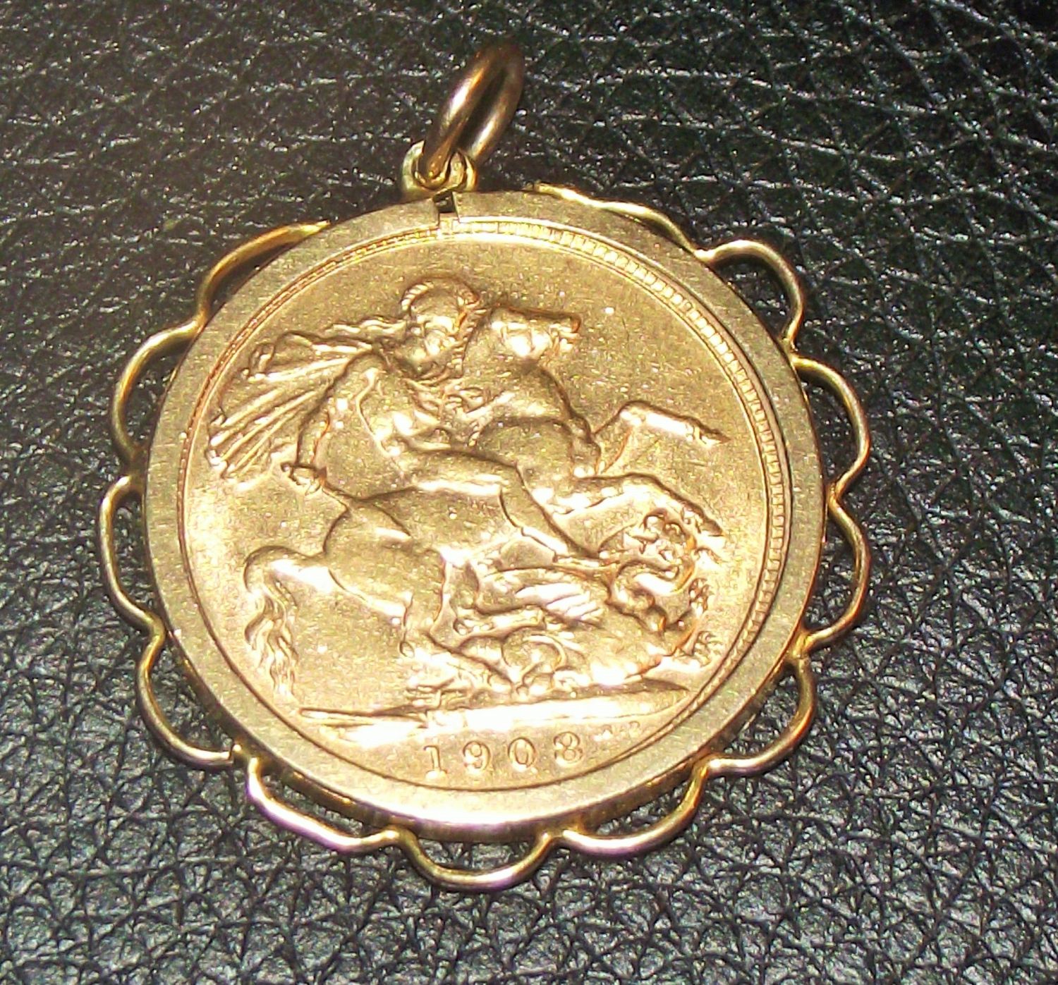 1908 22ct gold full sovereign in 9ct gold mount 9.5g approx