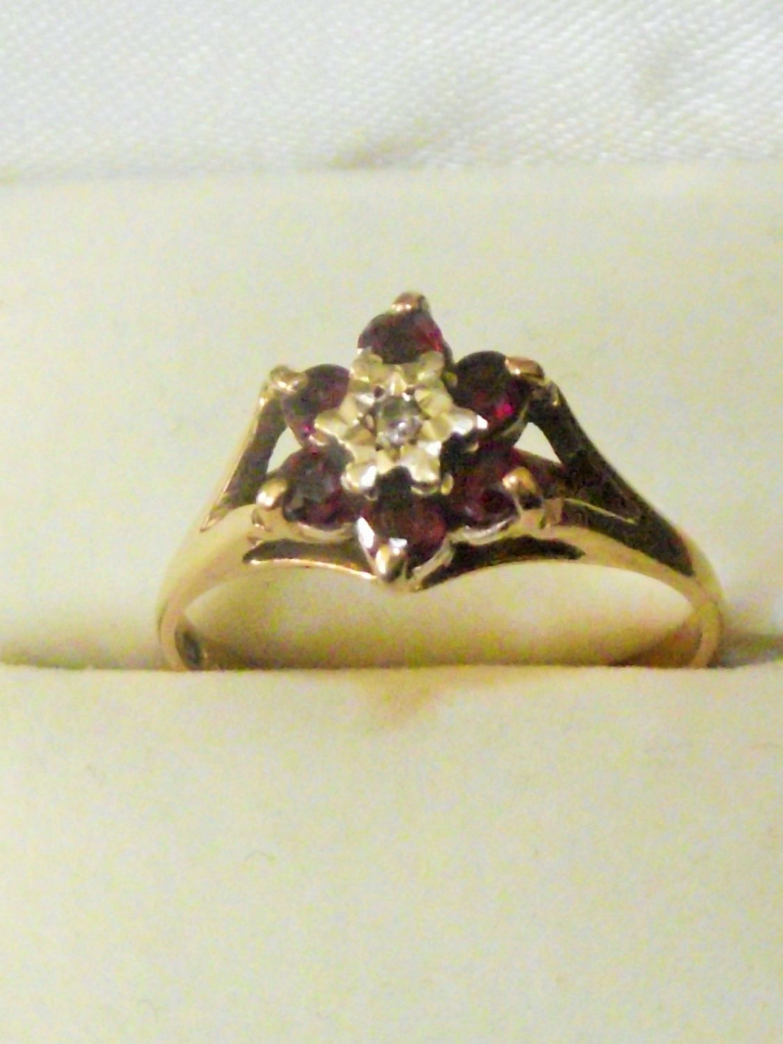 Ladies 9ct gold ring set with small central diamond surrounded with garnets 2.1g approx size M