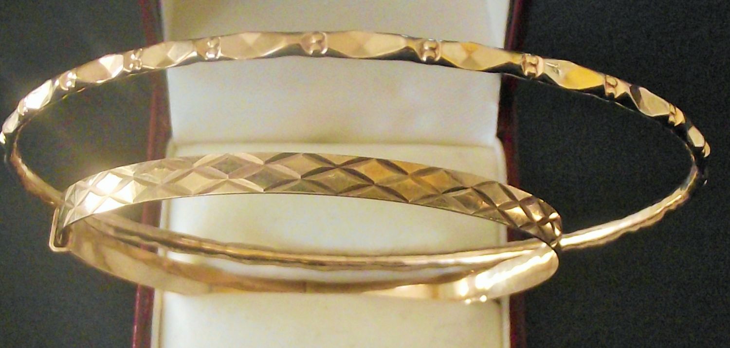 2x ladies 9ct gold bangles 1 solid and 1 siding ajustable bangle 7cm diameter 9.8g approx
