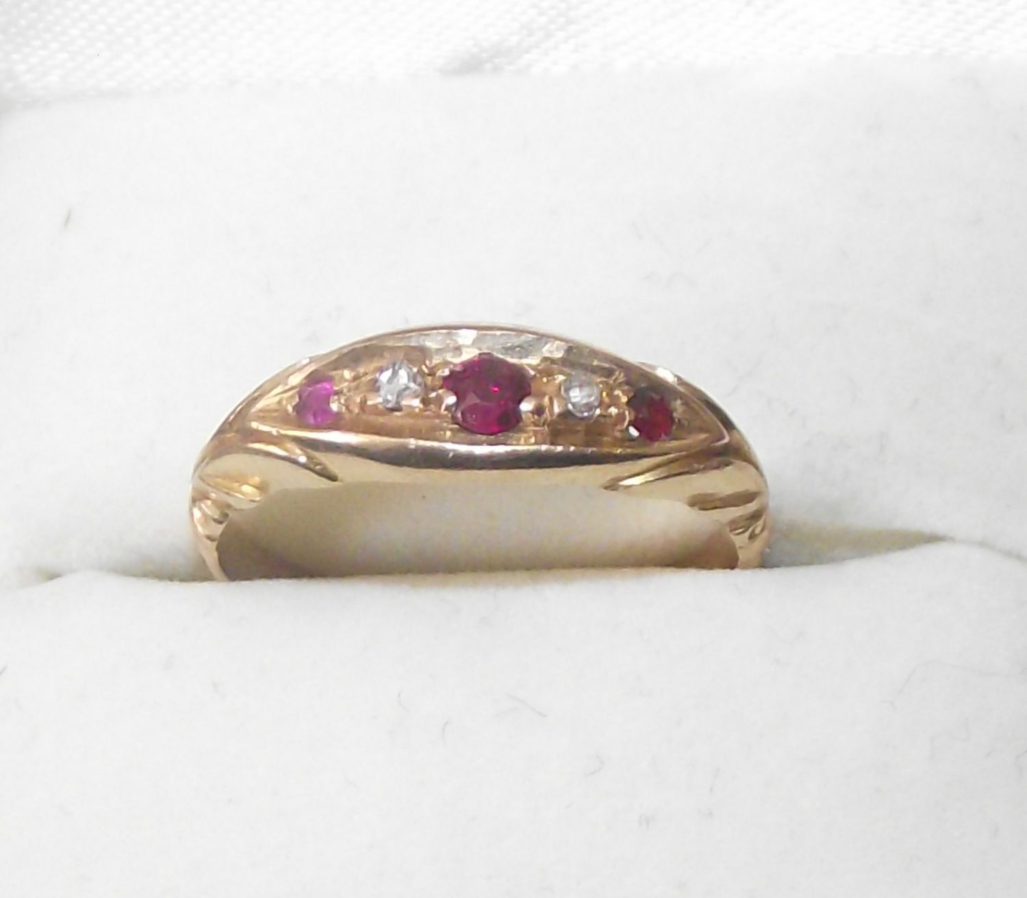 Ladies 18ct gold ring set with small diamonds & 3 small ruby style stones Size M 1.8g approx 3g approx