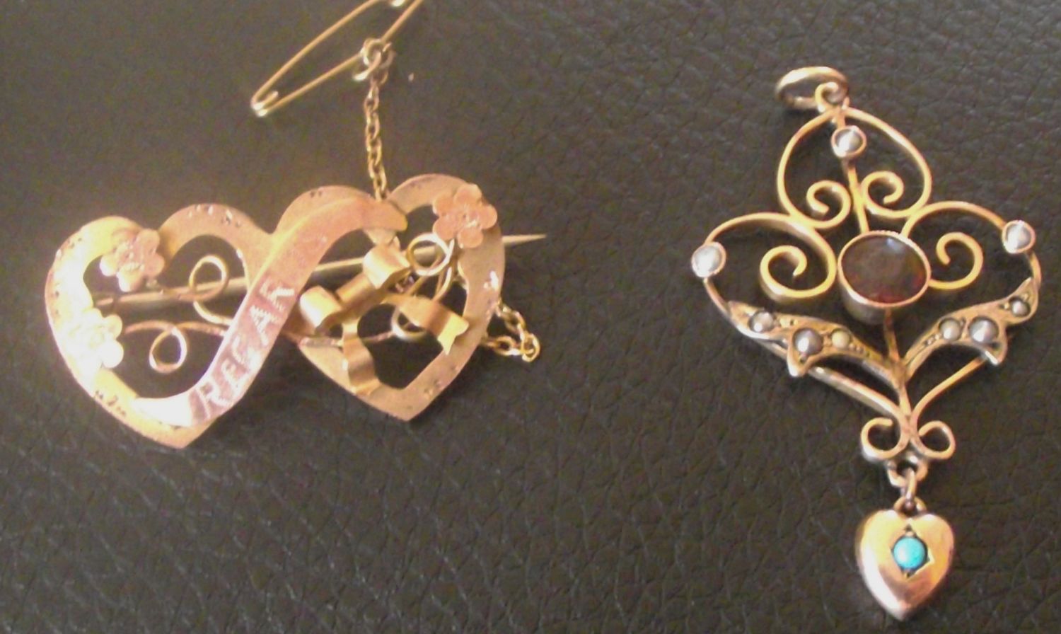 Edwardian love heart brooch engraved regards marked WBS 9ct steel back pin + Edwardian suspended pendant with tourquoise,pearls and central garnet style stone marked 9ct 4.6g approx