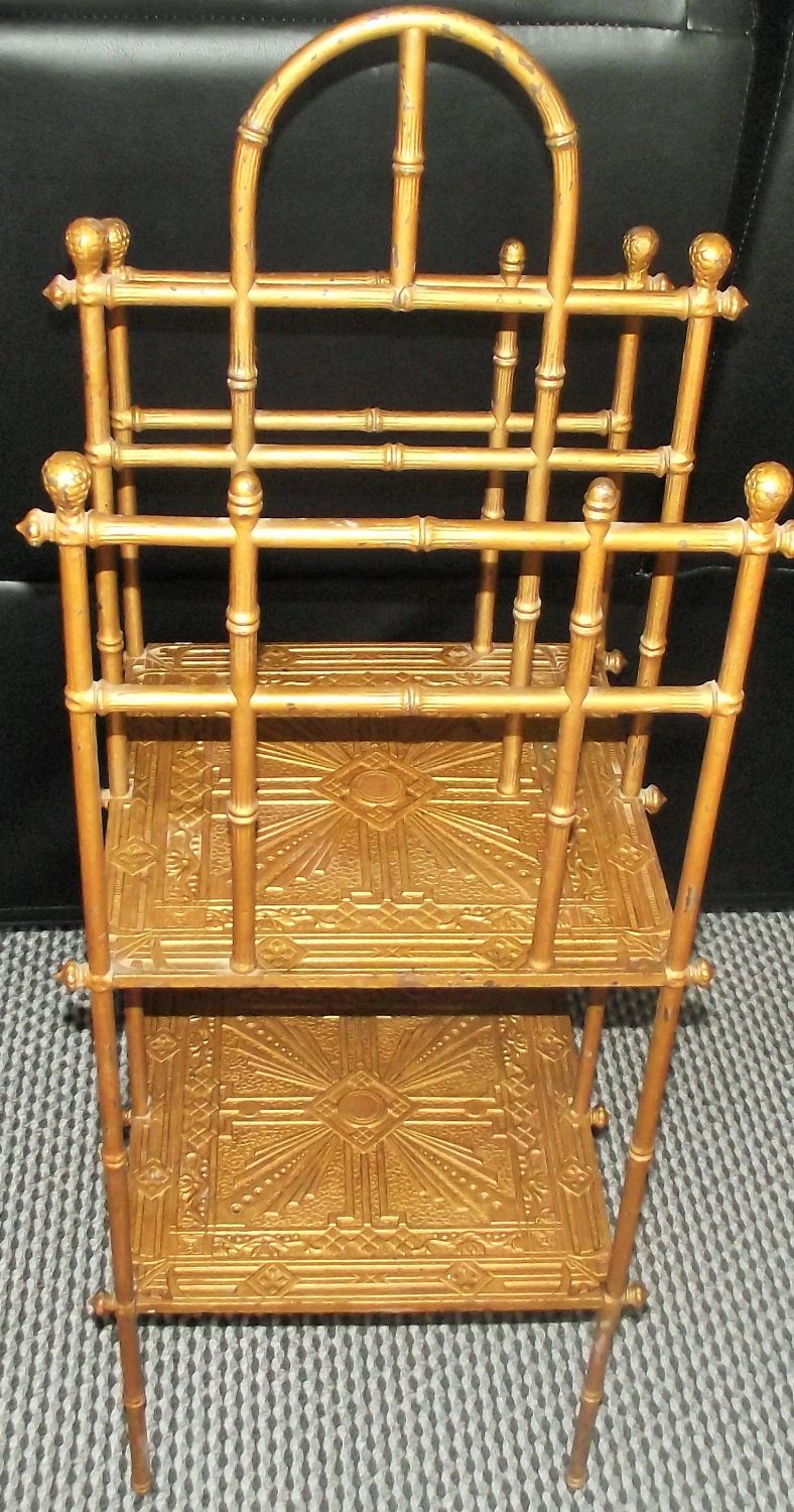 Heavy Art deco style solid brass gold laquered library 2 tier magazine rack with starburst panells , shaped supports in the form of bamboo with budding flower head finials 37″ approx