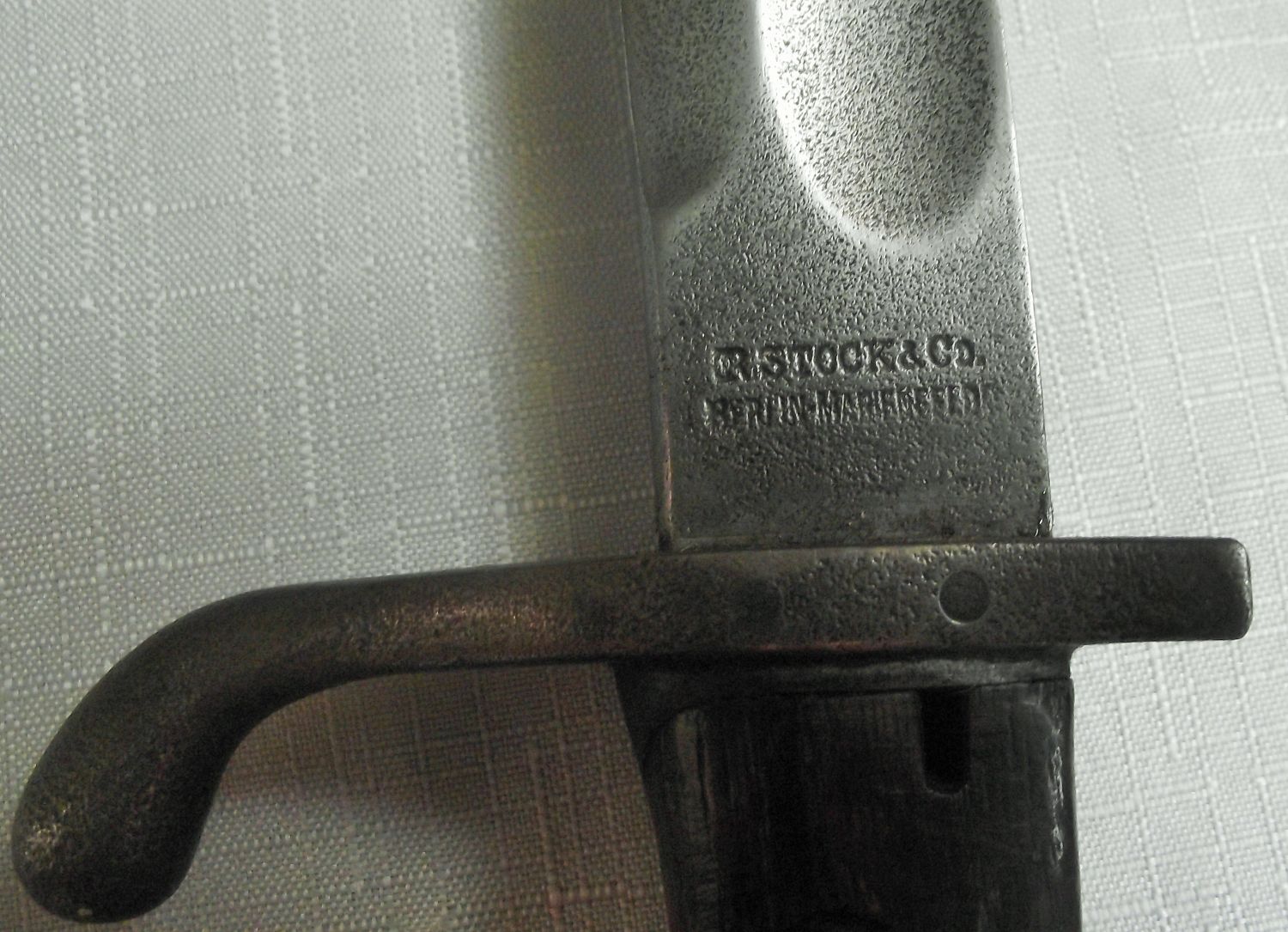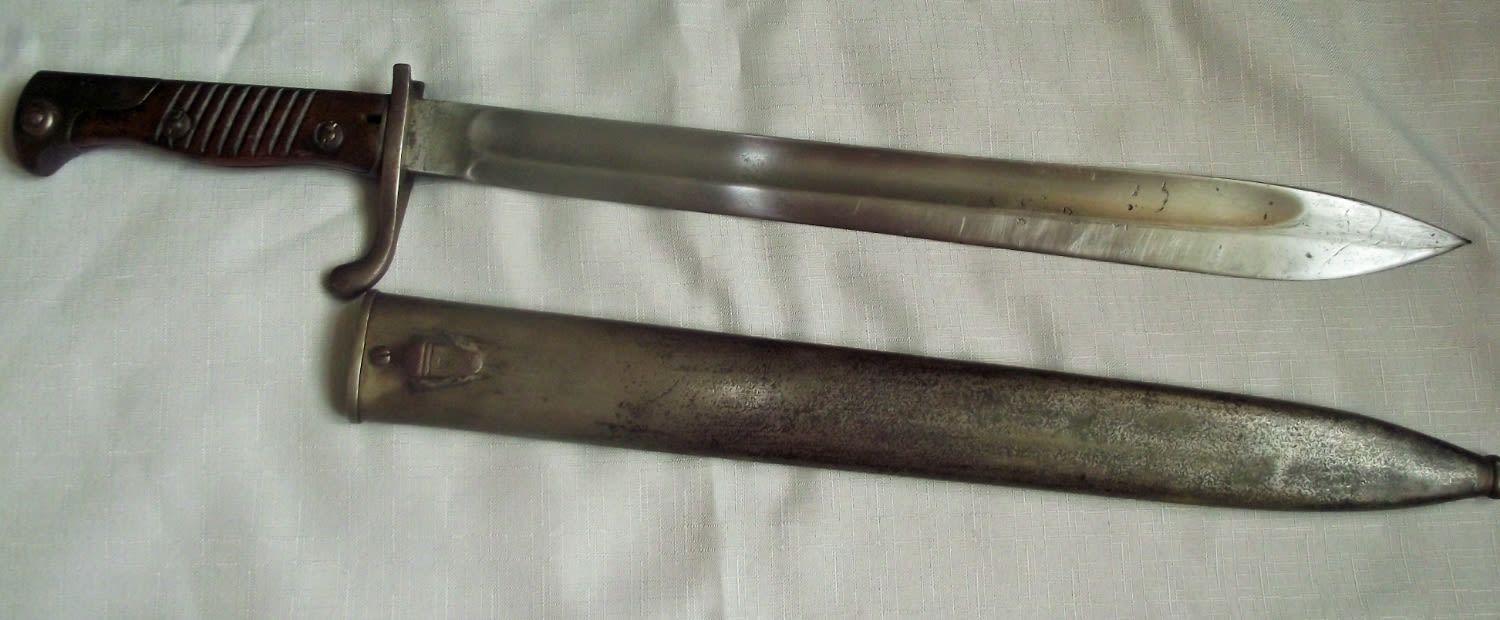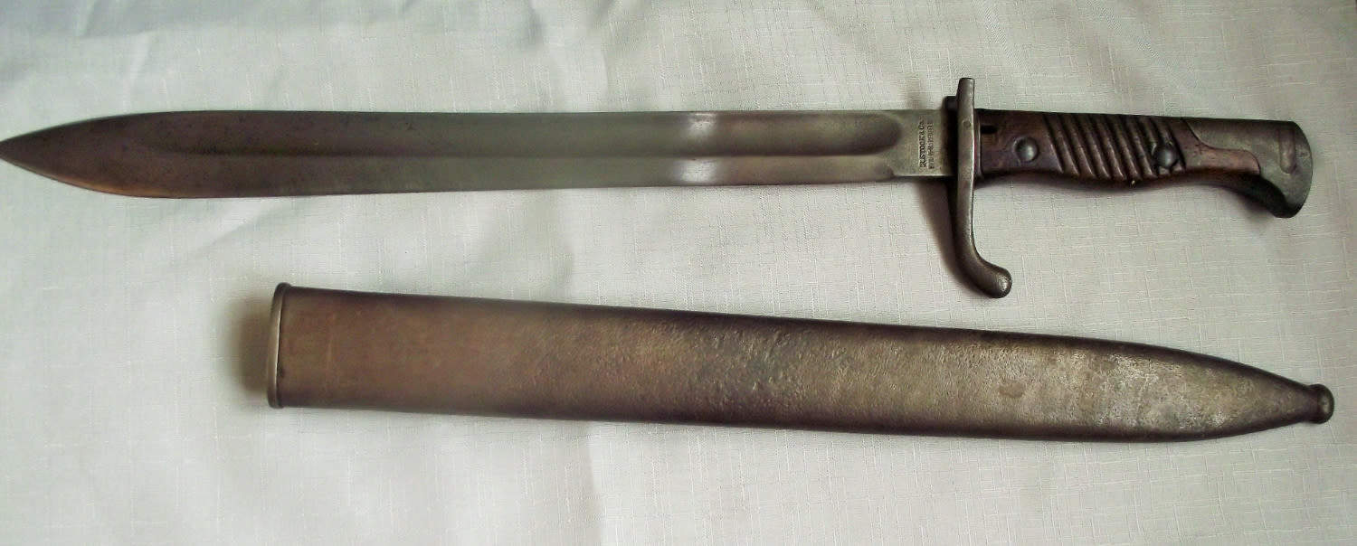 (Collectors Bayonets/Swords- Cannot be posted must be 18 years& above to purchase )WW1 Mauser Gew98 Bayonet type M1898/05 Old Pattern with metal Scabbard marked with crown 14.5″ blade .Blade Marked R Stock & co Berlin Marienfeld also marked blade with crown above W-15