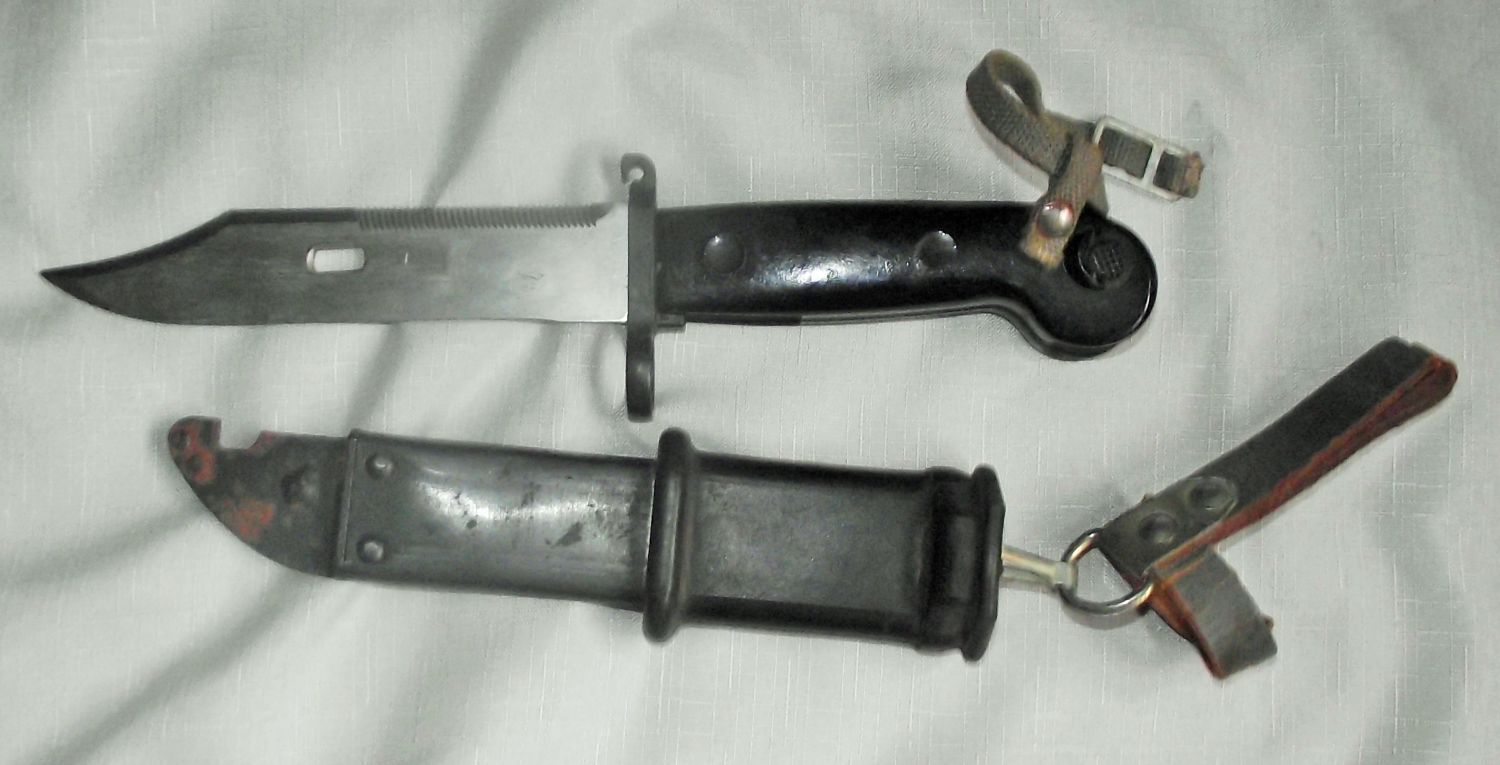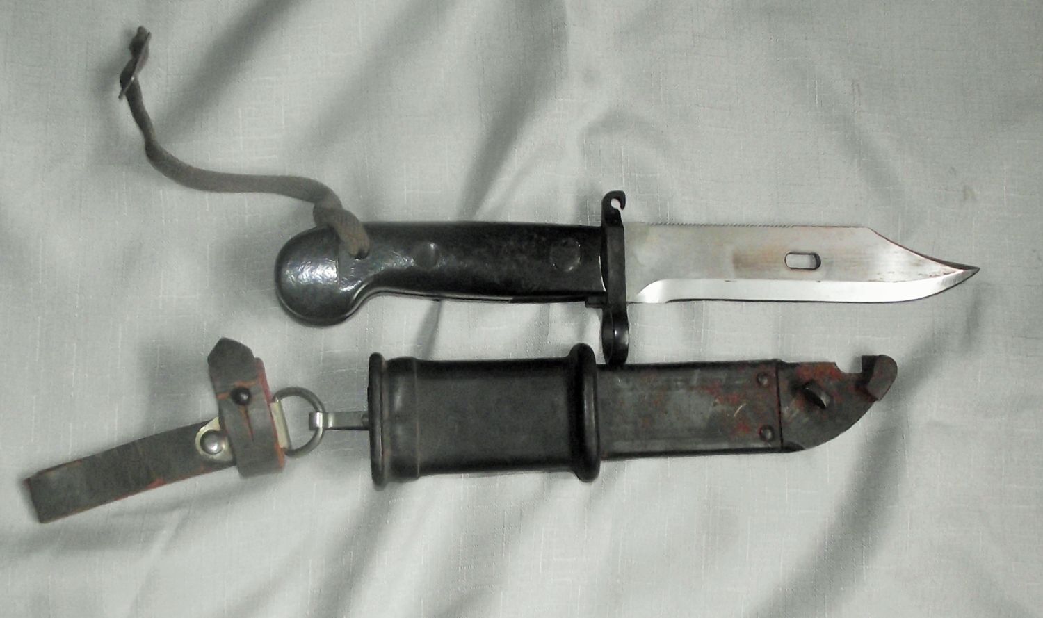A Russian AK-47 bayonet, having a 14.5cm blade with saw back, the steel muzzle no blade markings , in a rubber & metal mounted scabbard marked No2 marked on knife ring with numbers 00*1 some numbers not legible , 33cm,with wire cutter to end of scabbard