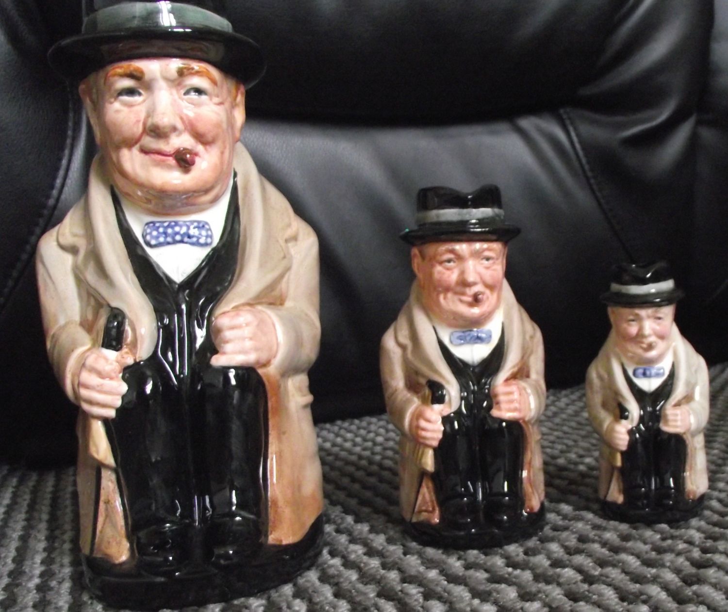 Set of 3 Graduated Winston Churchill toby jugs printed marks to underside 9-6-4″ approx