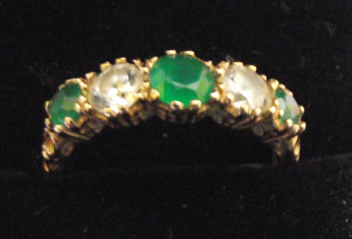 Modern 9ct gold dress ring fully marked set with 5 white & green stones size M 2.4g approx