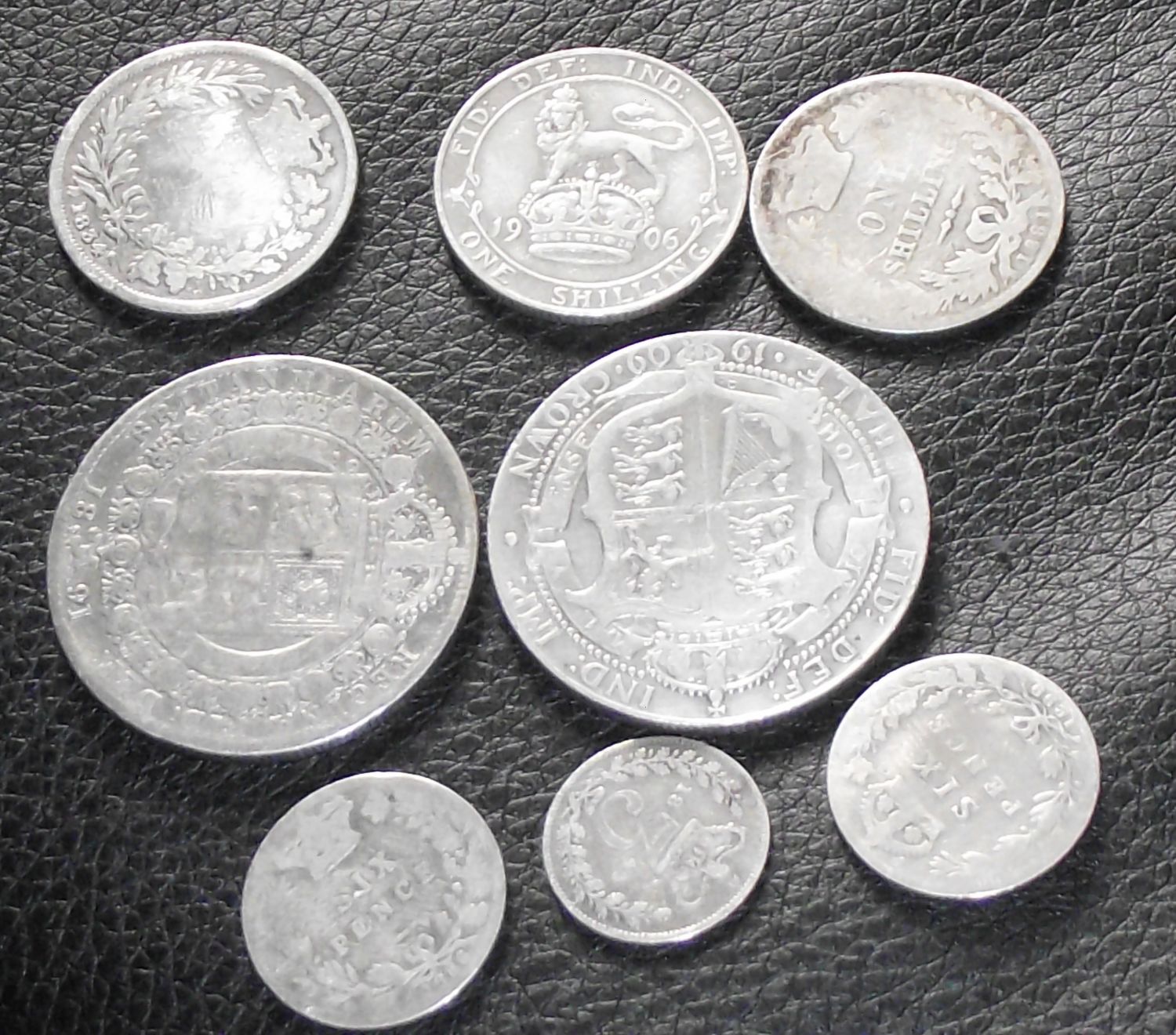small collection of silver coins inc 2 very good half crowns 1891/1909 + 3 x one shilling coins 1834,1881,1906+ 2x sixpence 1886,1988 &1x 3d 1845 49.5g approx
