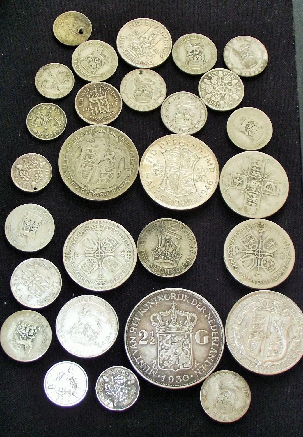 Collection of 50% silver british coins from 1920/46 inc. shillings sixpences half crowns etc + 1930 Netherlands 2.5Gulden 0.72% silver coin 156.8 g gross approx