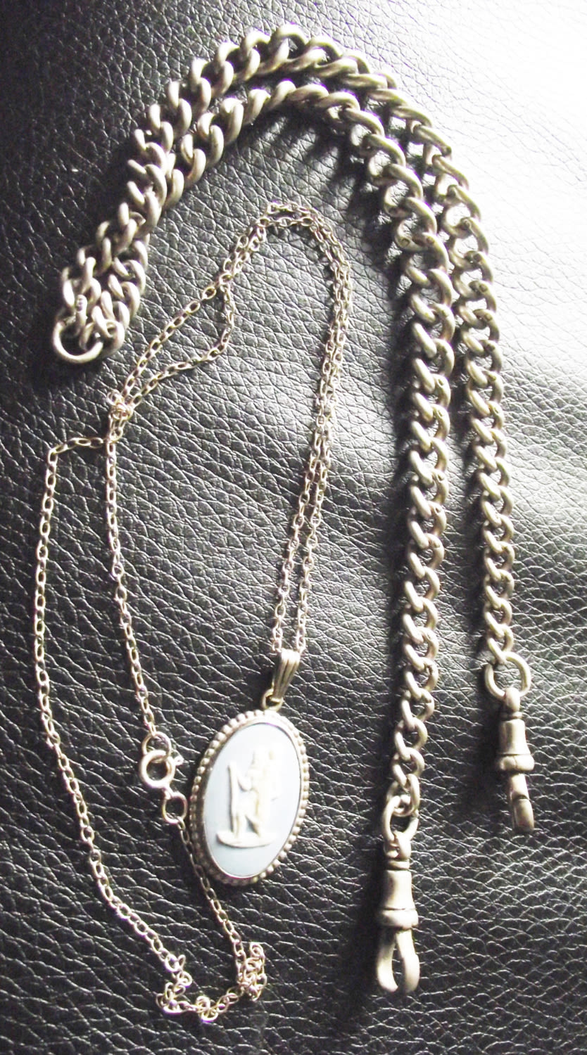 Silver Double Albert watch chain connected by single ring marked on every link & clasps + small silver chain with silver Wedgewood pendant 35.2g approx