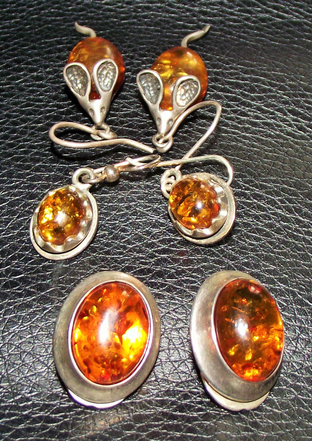 3x silver 925 pairs of vintage amber style earrings I clip set & 2 hook sets . One pair formed in the shape of small mice