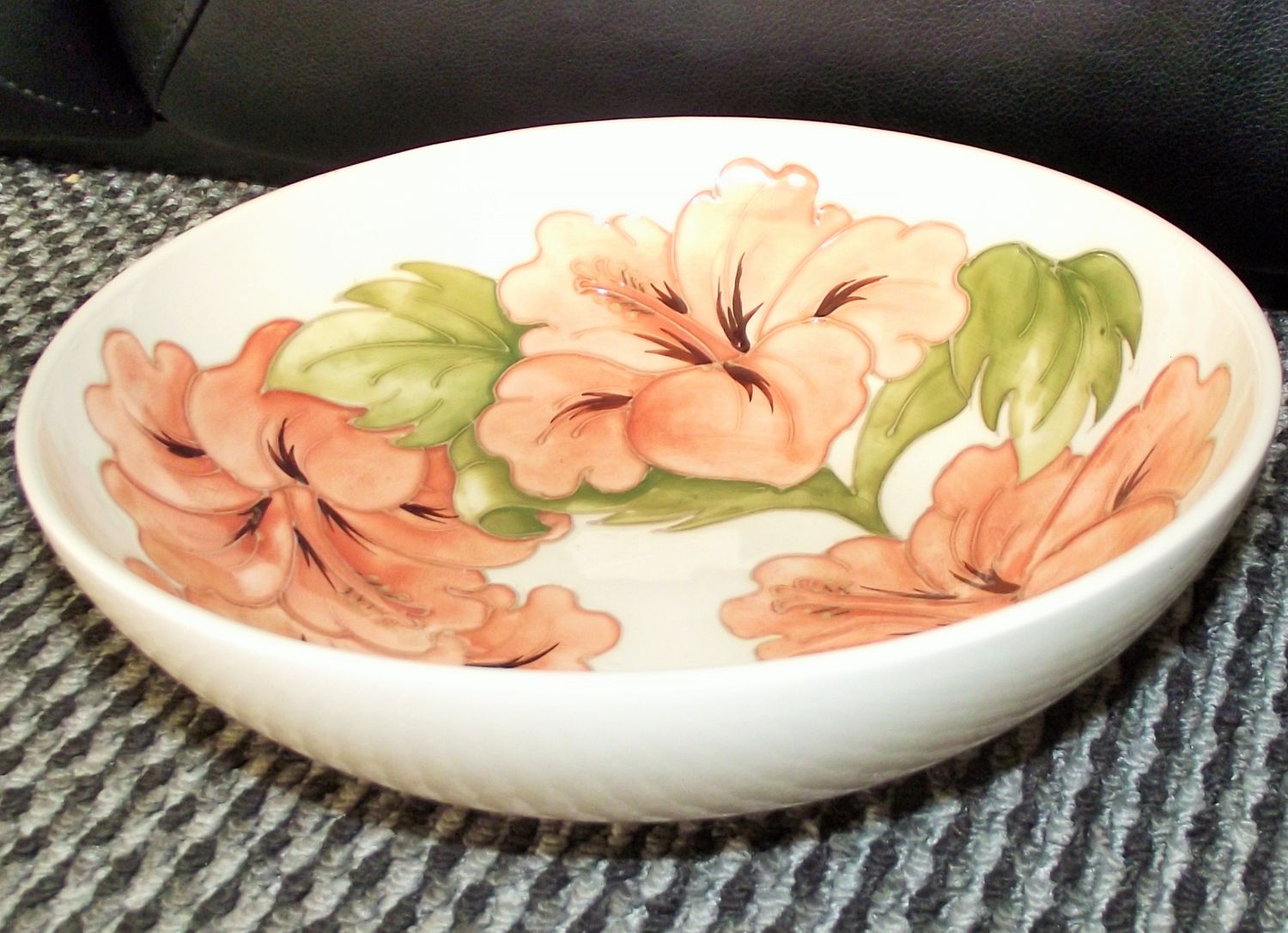 Large cream ground Hibiscus pattern Moorcroft bowl 26cm Diameter circa 1987 William John Moorcroft initials.