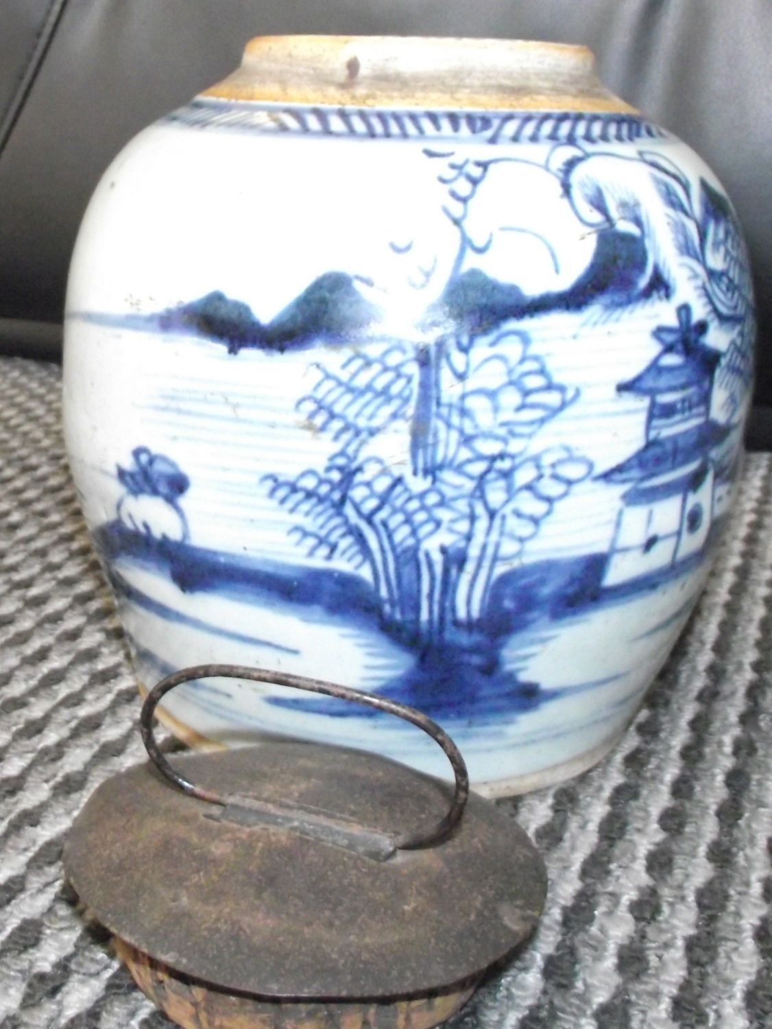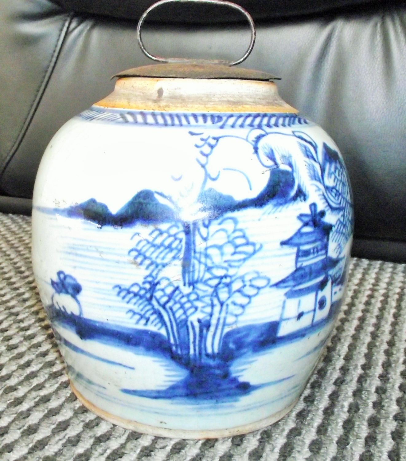 Large Antique 19thc blue & white decorated ginger jar with metal and cork lid 8″ tall approx no markings to underside