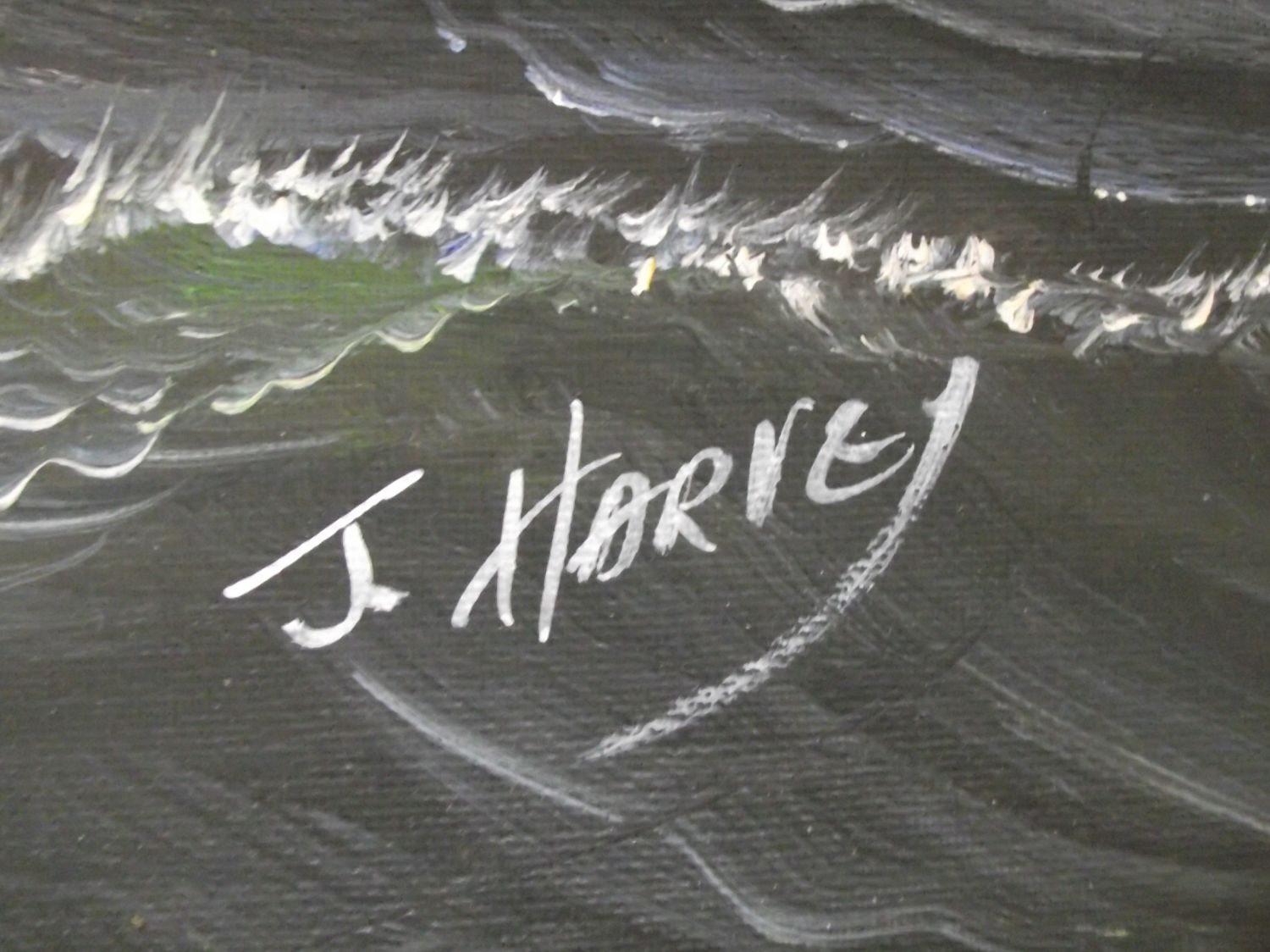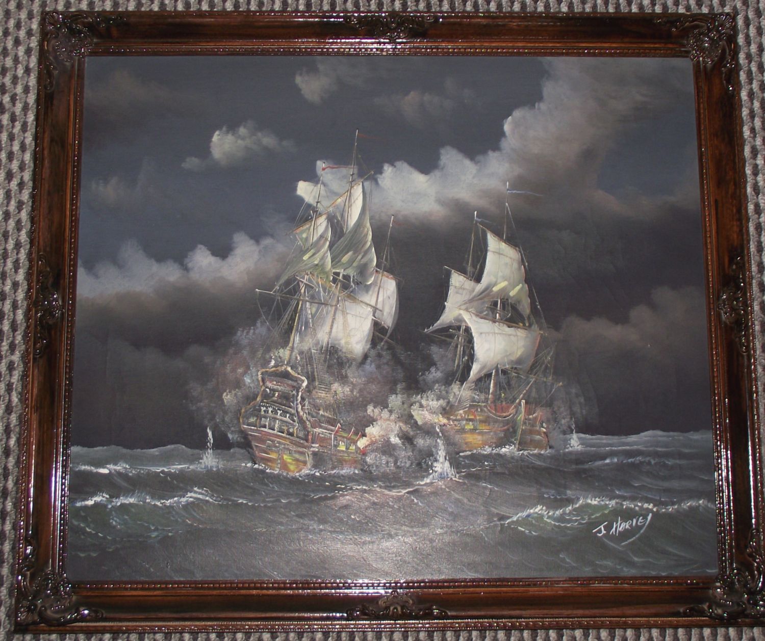ORIGINAL J.HARVEY Signed oil on canvas painting Fighting Galleons in brown frame