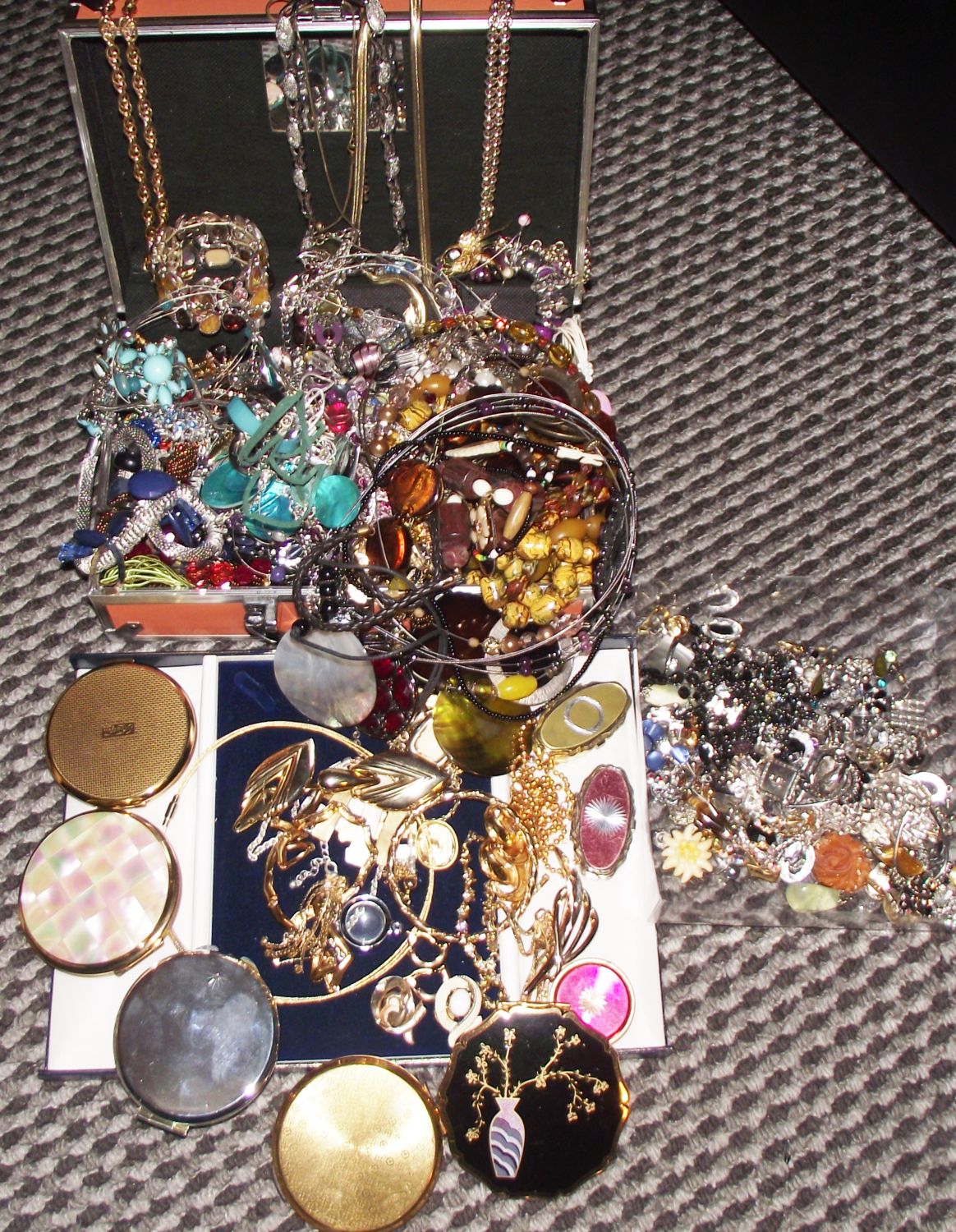 Nice large selection of assorted costume jewellery including earrings bangles necklaces some Stratton compacts & others + pill boxes ,vanity case included