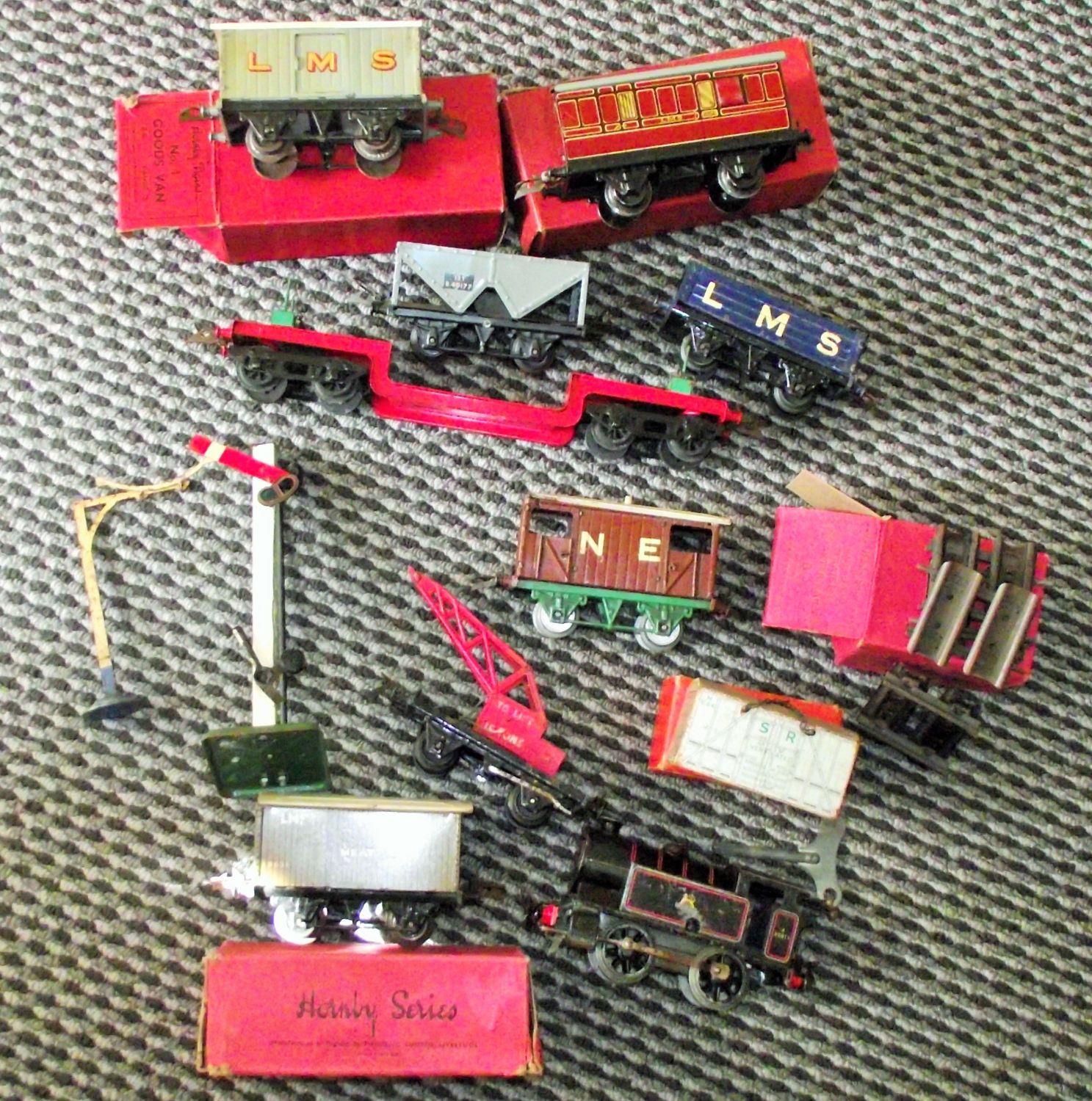 Selection of Hornby inc. 82011 clockwork train with key working , 10ton crain wagon , straightquarter rails , lowloader wagon , signals etc