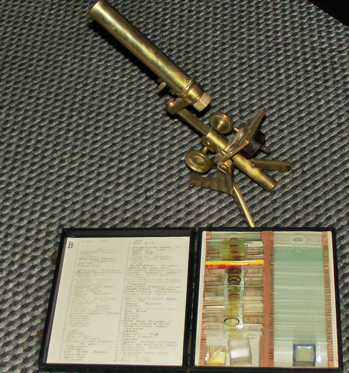 Rare brass 19thc F Davidson & co brass microscope + box of mixed slides some blank some prepared