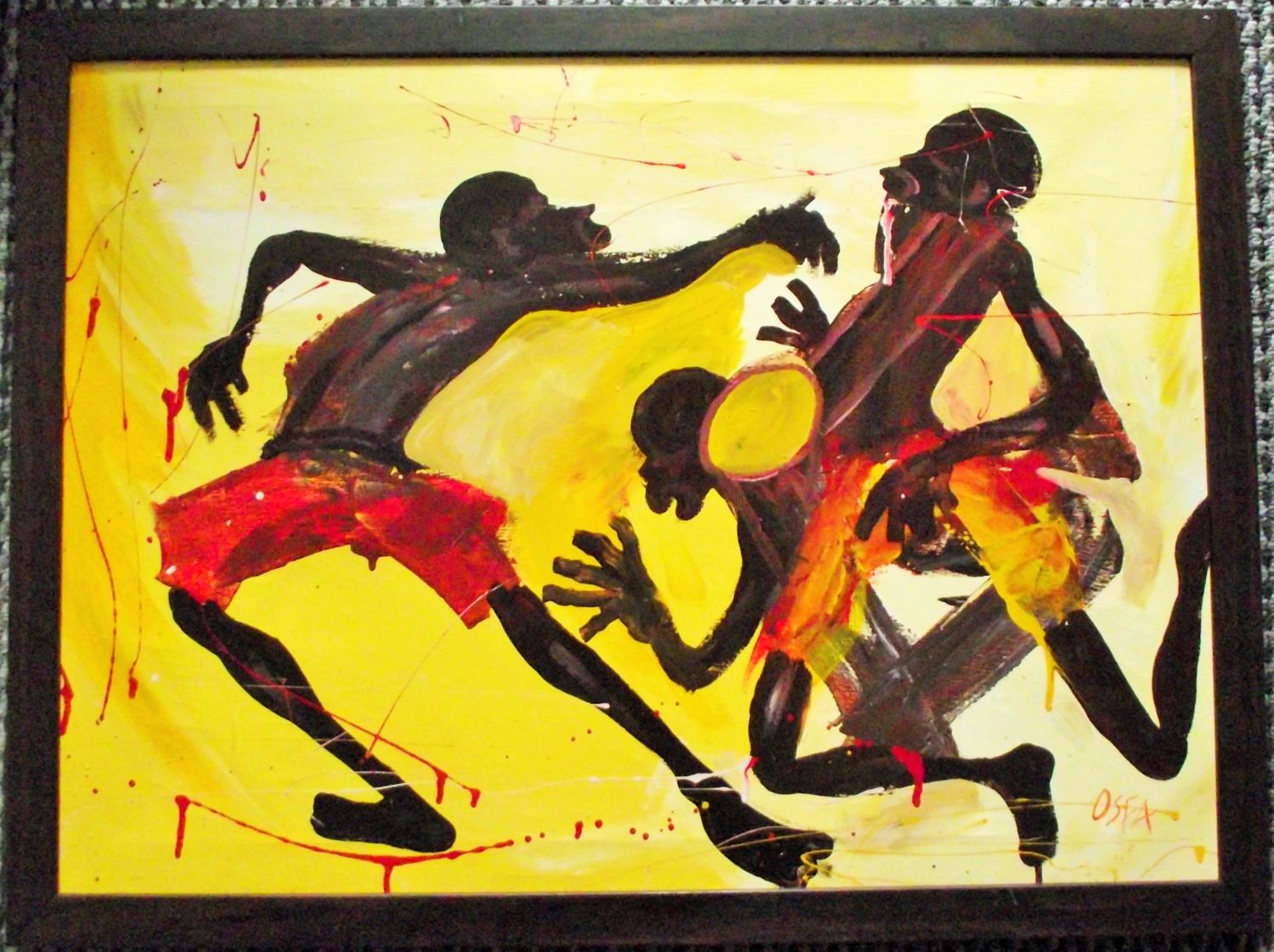 Mid century African art oil on canvas signed OSFA 30x 22″ approx
